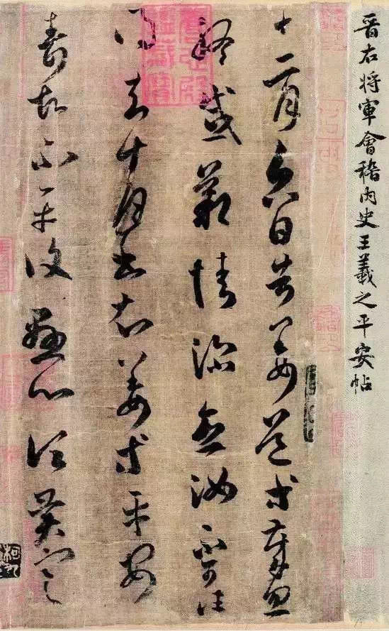《草书平安帖》又名《告姜道帖》,最早见于北宋著名丛帖《绛帖》,后经《宣和书谱》著录,当时共有九行,后被一分为二。上帖是前半部,为绢本,纵24.5厘米,横13.8厘米,共4行,41个字。《草书平安帖》上并没有作者的名款,但历史上大多数人都认为是王羲之所书。延展开这幅草书帖,41个字的周围盖满了几十方收藏鉴赏印章,可见其在漫长的历史长河中曾屡次易主。乾隆帝盛誉该帖“可亚时晴”,媲美“三希堂”瑰宝王羲之《快雪时晴帖》,民间流传王羲之高古摹本无出其右。