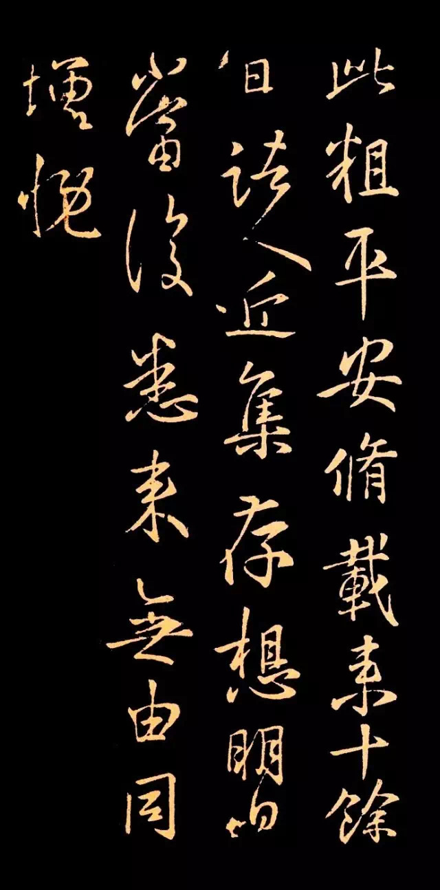 《平安帖》结字一般是取正局的,即不作作过多的欹侧,这容易形成排布,排布也就是状如算子,所以,处理好变化仍然是十分重要的。取正局又给人以多变的感受,一般来说,细微部分的变化要求就要高些。此帖中,最明显的变化是轻重变化。整体上看,帖右上部分轻,左下部分重。逐行看,第一行的轻重变化不大,但,每个字的内部是很有味道的。如“安”字,每一笔都用曲,中横的弯曲更是明显,整个字又稳如泰山。“载”字的土字头写法奇,车旁好像塞在半包围的框中。“来”、“余”的笔致变化,真有纸上舞蹈的韵味。类似的这此变化,保持始终,这便增加了“可读性”。当然,王羲之这些变化,不是“计划”来的,虽然有意在笔先之说,但,意是玄妙的,并不是像做建筑工程一样,一步步去实现蓝图。第二行的轻重变化是明显的,一看便知。到第三行,行笔开始加快,写得随意了些,往往用了草书的写法。