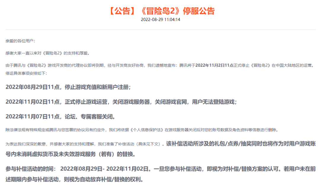 8月29日,《冒险岛2》官方发布了游戏停服公告。公告称,由于腾讯与游戏开发商代理协议即将到期,经双方协商后,腾讯将于2022年11月2日11点正式停止《冒险岛2》在中国大陆的运营,具体安排如下图:
