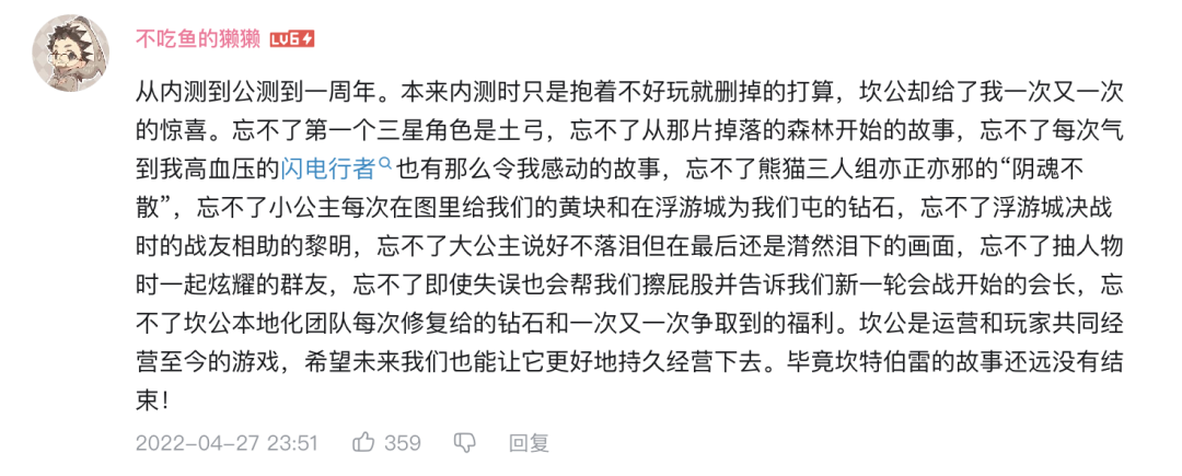 其次,《坎公》的宣传不仅捕捉产品的内容内核,还根据产品不同阶段所输出的内容,做更加高频且定制的情感输出。一位玩家在近期评论中提到,《坎公》的官方真的很懂玩家因为什么而感动,甚至让他觉得《坎公》已经成为玩家与官方共建的内容。