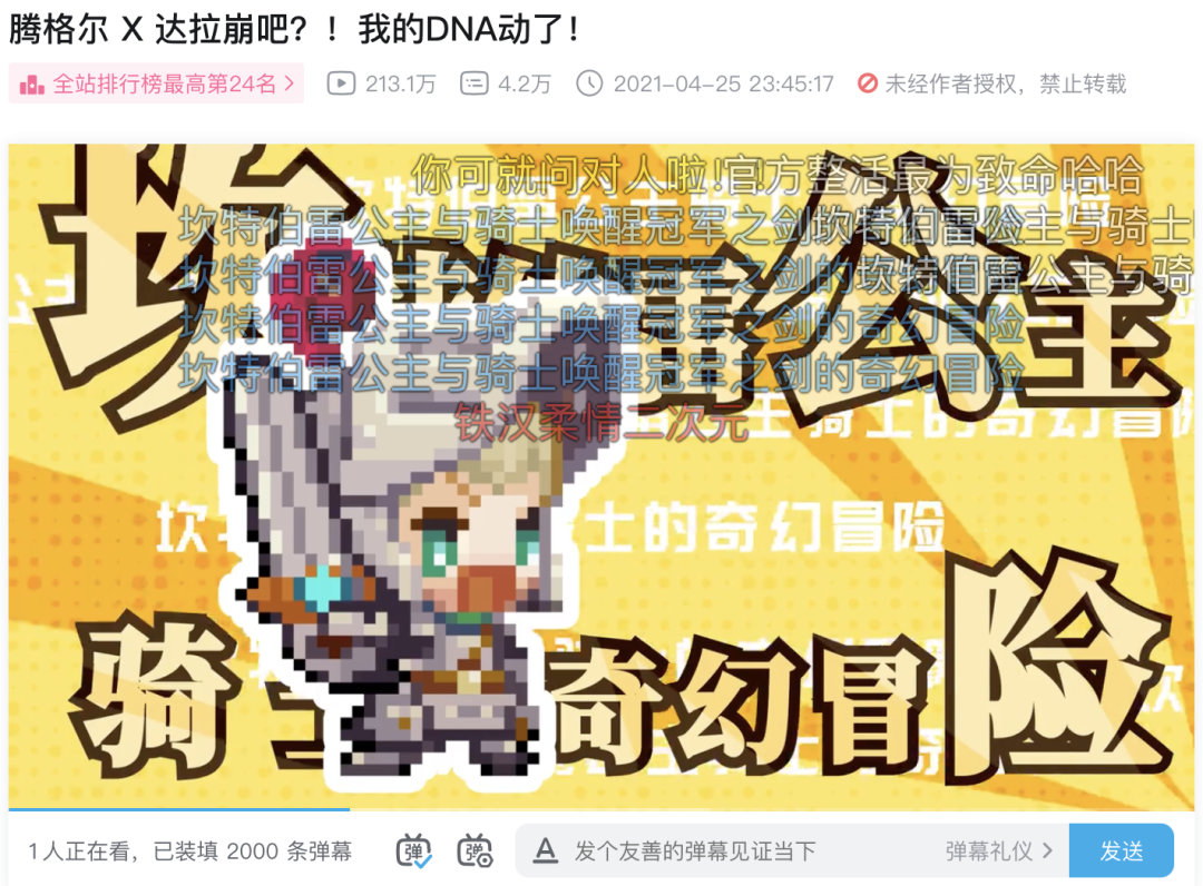 去年游戏上线,官方发布了与腾格尔改编《达拉崩吧》的洗脑音乐合作,将腾格尔做成了像素形象放到视频中,并收获了逾200万的播放量。其他动用主站资源的出圈节点,一旦涉及到像素素材,《坎公》也几乎都是倾倒式地推广。