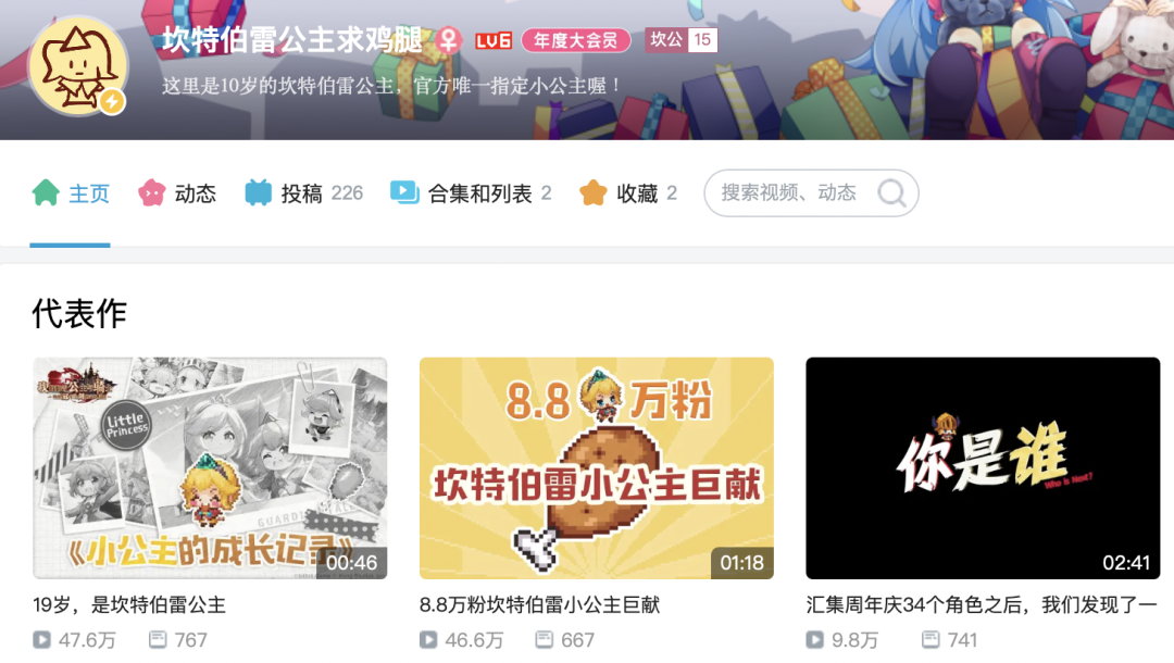 例如,官方运营除官号宣发外,还额外建立了「坎特伯雷公主求鸡腿」的账号,以小公主的口吻与玩家互动——小号也已经积攒了不小的粉丝量,所发布的视频也获得了许多玩家的互动。
