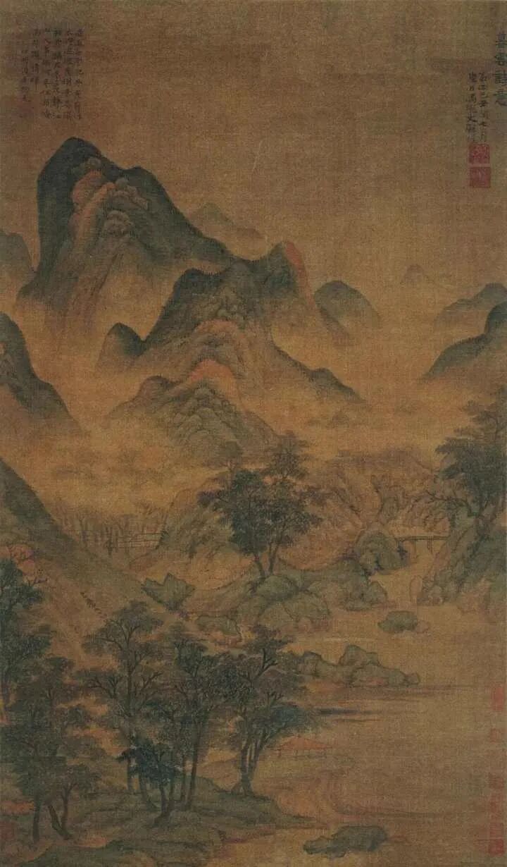《暮云诗意图》,绢本设色,纵96.5厘米,横56.3厘米,现藏于上海博物馆。此画在水墨皴染的基调上,兼施淡淡的青绿,附加薄薄的赭石提勒,描绘了雨后新霁、千山凝碧、暮色苍茫、诗意盎然的景致。画面近景陂陀起伏、平冈延绵,其上林木深秀,一片葱郁。画面右下方溪流屈曲回环,汇聚成潭,气韵灵动。临水有亭,以简洁的线条勾勒而出,其赭石色的亭顶成为近景中的画眼。画面中景岗陵深处山谷蓊蓊郁郁,烟岚萦绕,画家描绘房舍数间,有“可居”之意。右边隔溪以板桥相接,典雅古朴。中景几处林木或枯或荣、或浓或淡,层次分明,错落有致,与近景的林木遥相呼应,意境悠远。画面远景层峦逶迤, 危峰矗立,以伟峻的气势俯视着左右的陂陀。偏向左侧的主峰墨色凝重,用披麻皴反复皴擦,笔法老练而柔韧。山顶矾头和山脚卵石的画法简洁明快,颇有董源笔意。远山和树丛则充分吸取了米芾米家山水的技法,用浓墨、淡墨、积墨、淡彩,或淡抹轻染,或纵横点染,山峦陂陀施以青绿,山巅阳面敷以赭石,树叶染以花青,生动地表现了雨霁暮色下微妙的光影色泽变化。