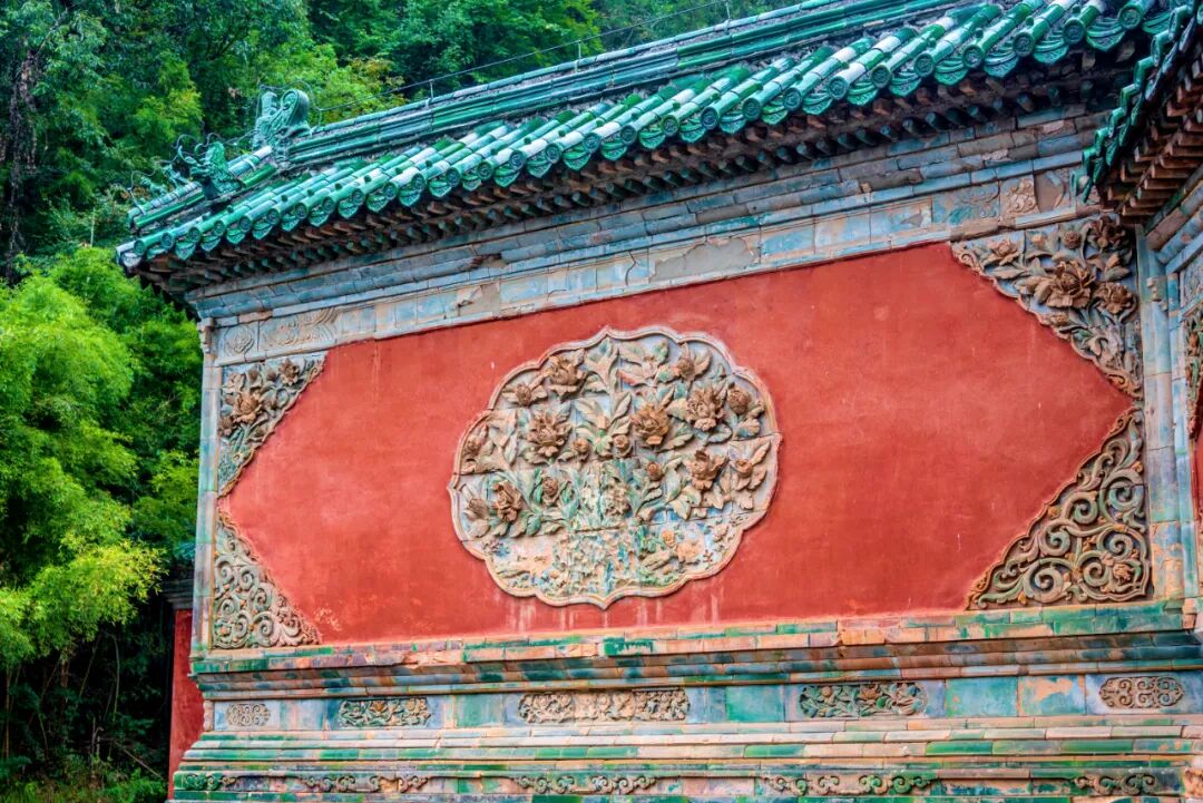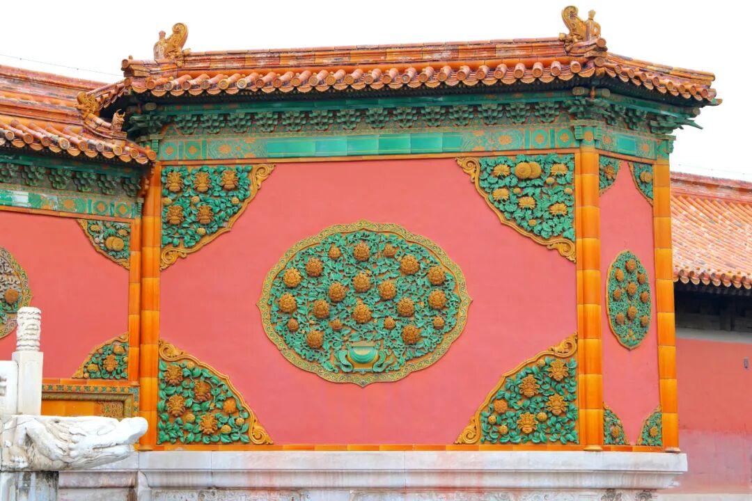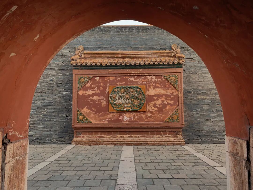 影壁位于端门外,下部束腰壶门,壁面、瓦顶均为琉璃镶嵌。影壁高6.5米,长13.06米。