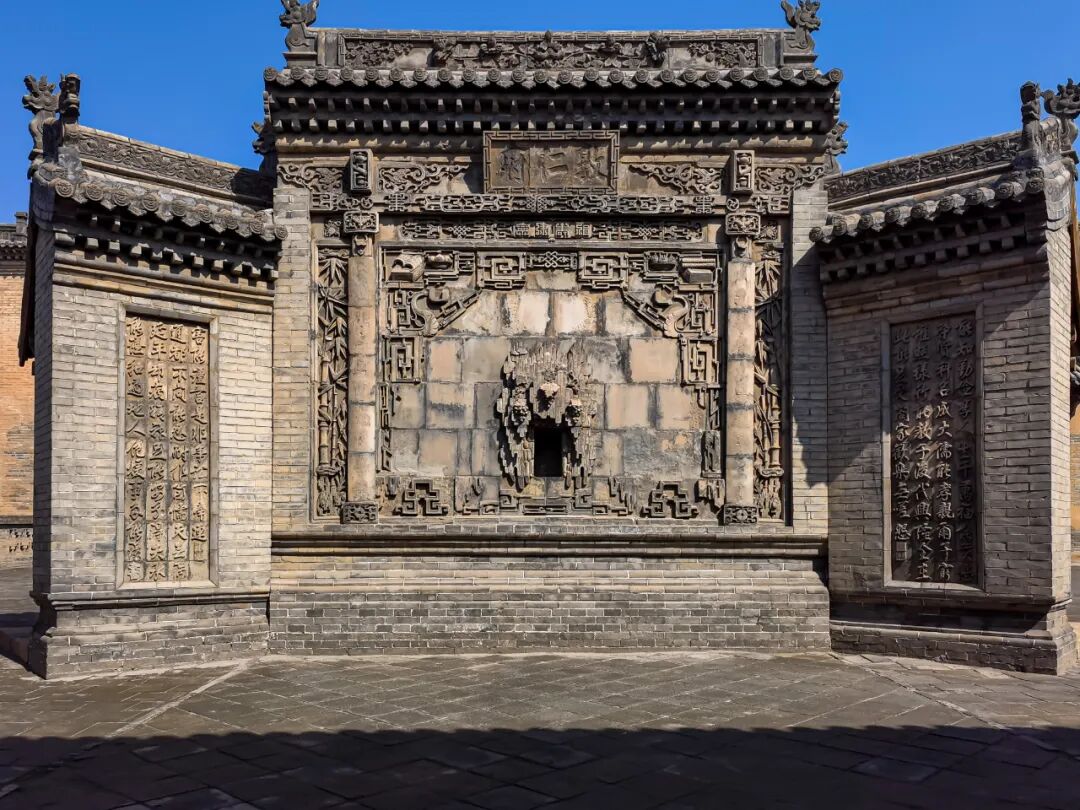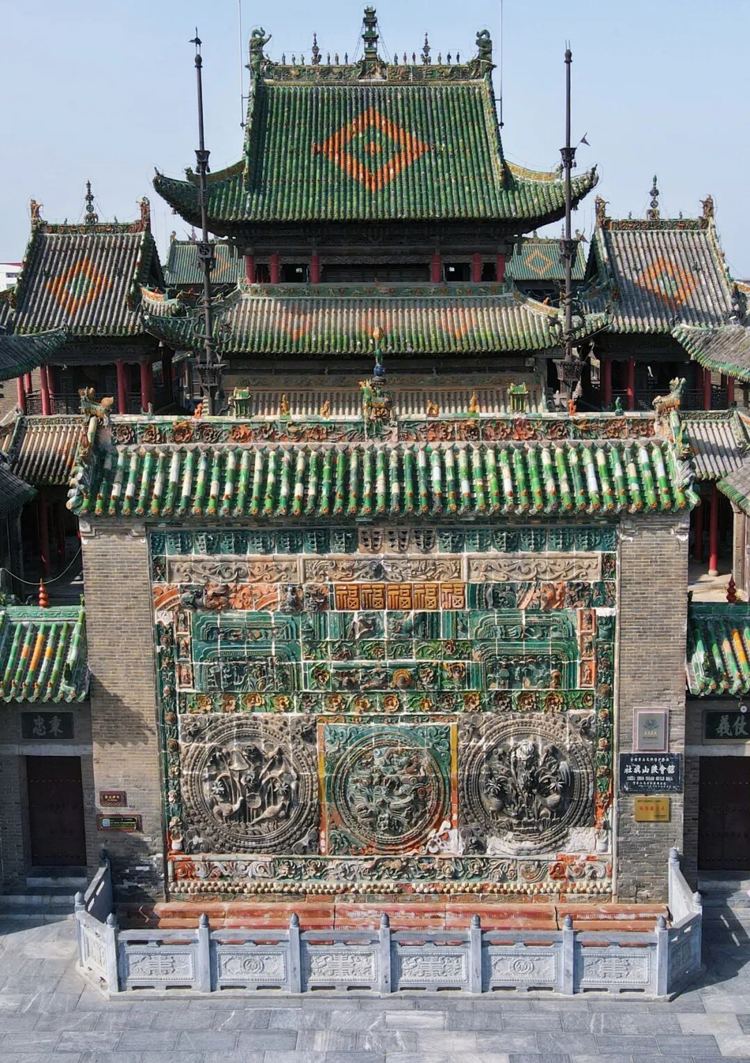 介休后土庙规模宏大,中轴线上四进院落,殿堂楼阁十余座,屋顶几乎全都施以琉璃,绚丽华美。乐楼两侧各砌砖影壁一座,影心部分以黄绿色琉璃雕山石、流云,正中卧麒麟。