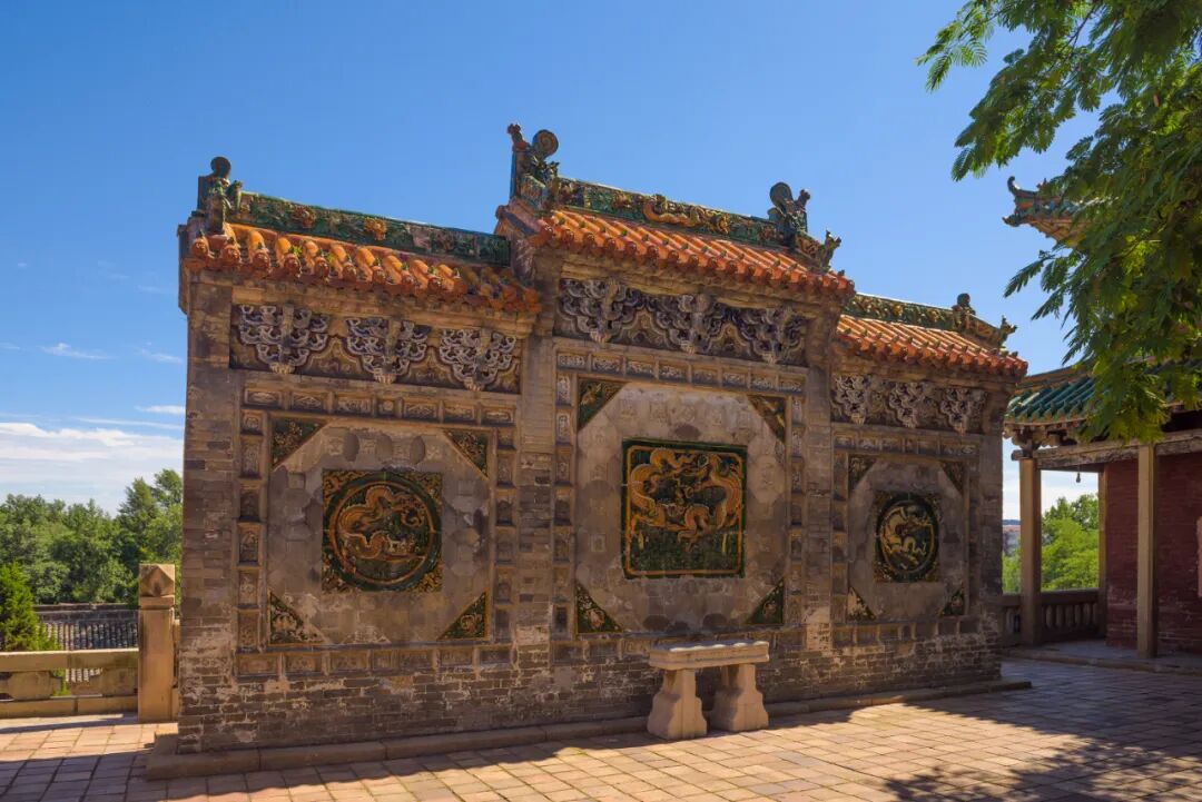 福陵位于沈阳市东部,是清太祖努尔哈赤和皇后叶赫那拉氏的陵墓。在福陵的大明楼后面,有一座月牙城,城的正中间有一面琉璃影壁。影壁基座、壁心和檐部原本都是用琉璃镶嵌而成的,如今只有黄琉璃瓦顶、影心及四个岔角保存较为完整。中央的盒子上有11 朵宝相花,极为精致。