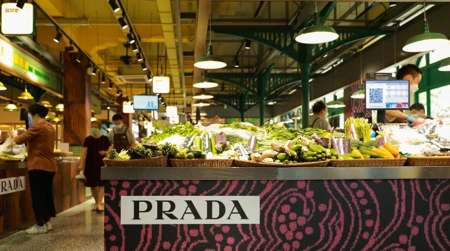 拿去年Prada开进菜市场为例。Prada和上海网红菜市场乌中市集合作,打造快闪店铺,旨在通过用印花包裹城市中不同风格的建筑,重塑不同城市的街道风景。用 PRADA 的秋冬季印花包裹市场的外立面,每日限量为买菜的顾客提供印花包装袋。