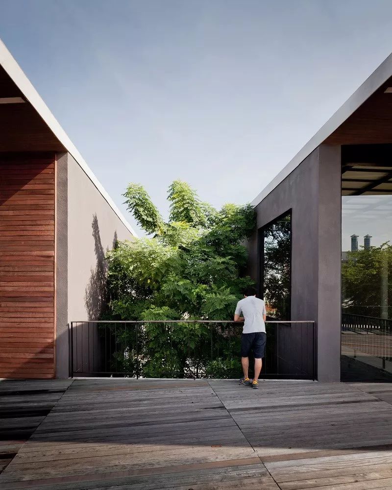 屋顶材质由混凝土构成,地面则由木板和绿色植物构成。