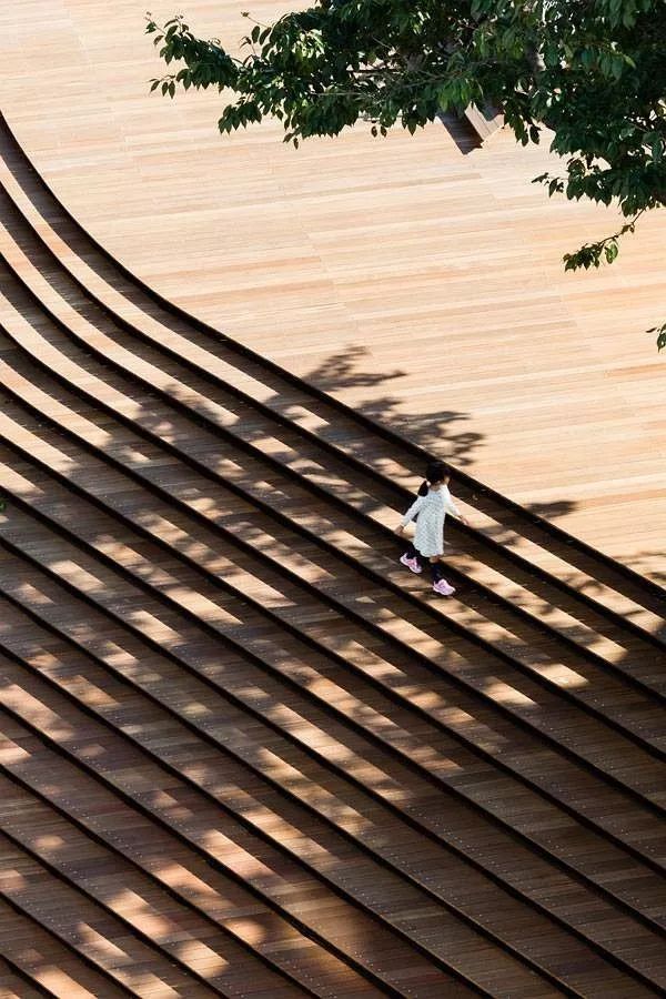 如同等高线一样的木质阶梯不仅在视觉上与周边环境地形相契合,更是创造了一种独特的、亲切的道路形式。