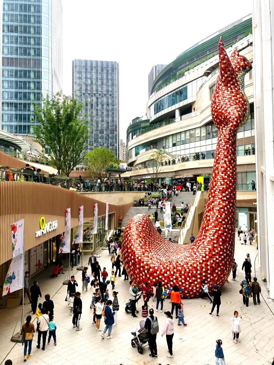 自然森林空间内当然要有活泼的生命力,重庆光环购物中心请人设计了永久性艺术装置“松鼠闪闪”,这是由16500片特制的彩色金属片组成,在不同的光线下会折射出不同的光芒,值得一提的是,这个活泼可爱的松鼠不仅仅是重庆光环一处标志性的打卡地,如今已经成为商场的一个IP,结合闪闪形象,在闪闪商场内打造“闪闪体验营”,深度维护家庭亲子客群,提高家庭用户粘性。