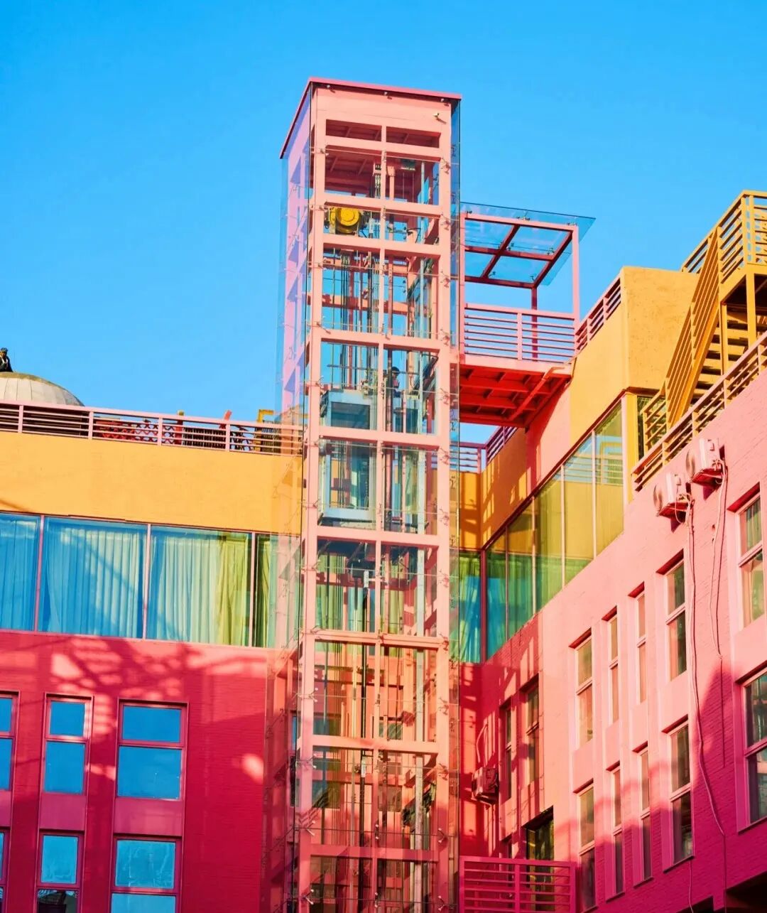 亮粉色的主体楼面,明黄色、名蓝色的景观,以及地中海式的楼顶建筑,高饱和度、高颜值的的色彩空间设置,随便一拍,立马出片,时尚人士们的争相打卡,让五只猫娱乐Mall立马成为北京新晋热门的五彩缤纷打卡圣地。