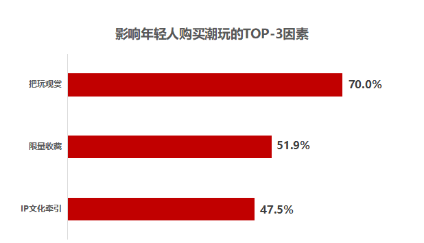 数据显示,70%年轻人因潮流玩具颜值高、具有把玩观赏性的理由选择购买潮玩;51.9%的年轻人认为潮玩限定款或合作款,有收藏价值;47.5%的年轻人出于对IP作品的喜欢,会购买周边潮玩产品。