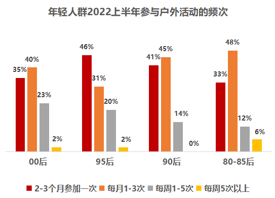 整体来看,超六成的年轻人群每月户外活动≥1次,超三成人群下半年计划增多。其中,80-85后及00后在户外最为活跃,95后参与户外活动的频次最低。