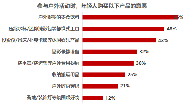 值得一提的是,年轻人群在参与户外活动时,对食饮、便携工具、娱乐产品的购买意愿最强。43%的年轻人会购买休闲娱乐产品,他们多以95-00后为主。90后和00后对摄像录影设备购买意愿强烈,也是氛围感好物的主要消费人群。