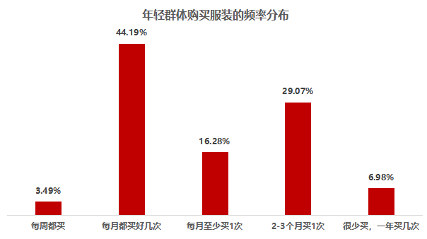 年轻群体中每个月都会给自己添置新服装的比例超过60%,其中夸张另类款、嘻哈风等突显个性的服装购买频率相对更高。英伦学院风、职业装以及三坑服饰,在年轻群体穿搭圈层中属于月度消费频率表现平稳的款式。
