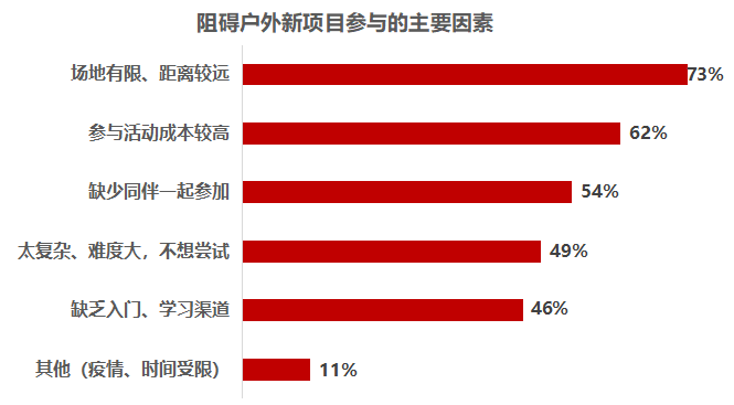 对于00后而言,学习压力与初入职场的工作压力是导致户外活动时间不足的重要原因,放松心情、缓解压力是他们的最大需求,同时乐于学习新技能;95后对结交新朋友及通过户外活动强身健体的需求较其他群体更加强烈;90后群体的需求相对更加多元,以释放压力、增进关系、陪伴家人、拓宽社交圈为主;80—85后一方面希望陪伴家人和孩子、增进情感,另一方面,希望不断增强户外项目的技能、发展业余爱好、结交志同道合新朋友。