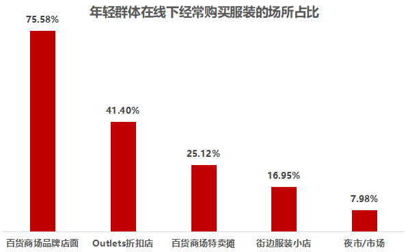 在购买渠道上,超七成的年轻人习惯去品牌专卖店购买服装,随着年龄的递增,不同代际对消费场景的包容性逐渐增强,00后街边服装小店消费比例近4成。