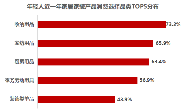 收纳、家纺、厨房用品是年轻人集中消费的TOP3家居家装产品,分别占比为73.2%,65.9%以及63.4%。