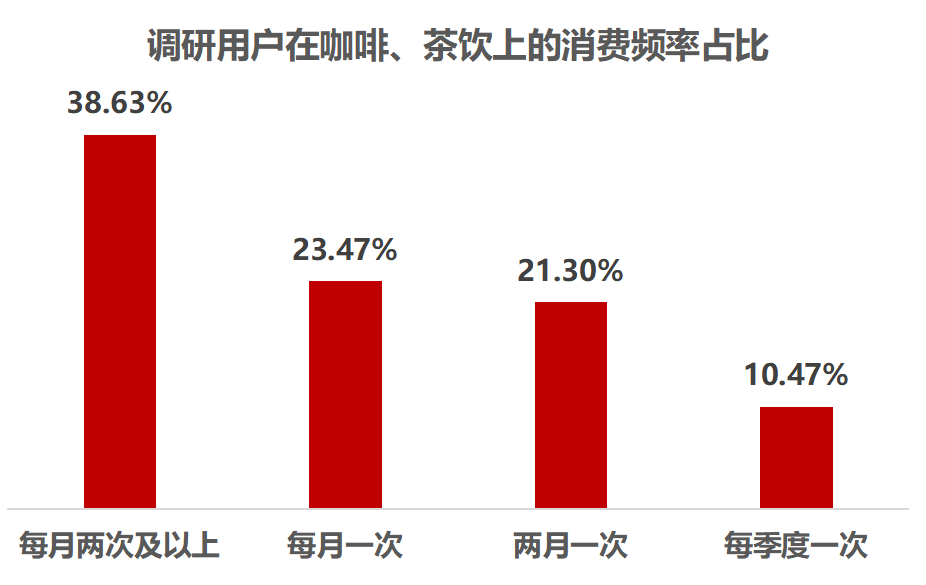 在消费金额统计数据中,五成消费者针对咖啡或茶饮产品的月均支出150元以下,其中在50-100之间的月均消费金额占比较高。另外,在消费频率统计数据中,每月消费两次及以上的人群占比高达38.63%。尝鲜与适量(可饮用1-10次)是年轻人对咖啡、茶饮产品的消费特点。