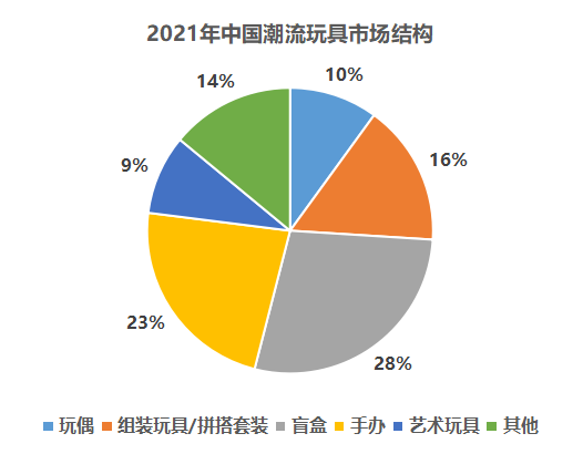 中国潮流玩具市场规模由2017年的108亿元增长至2021年的345亿元。其中,在2021年中国潮流玩具市场结构中,盲盒占比最大,为28%;手办次之,为23%。