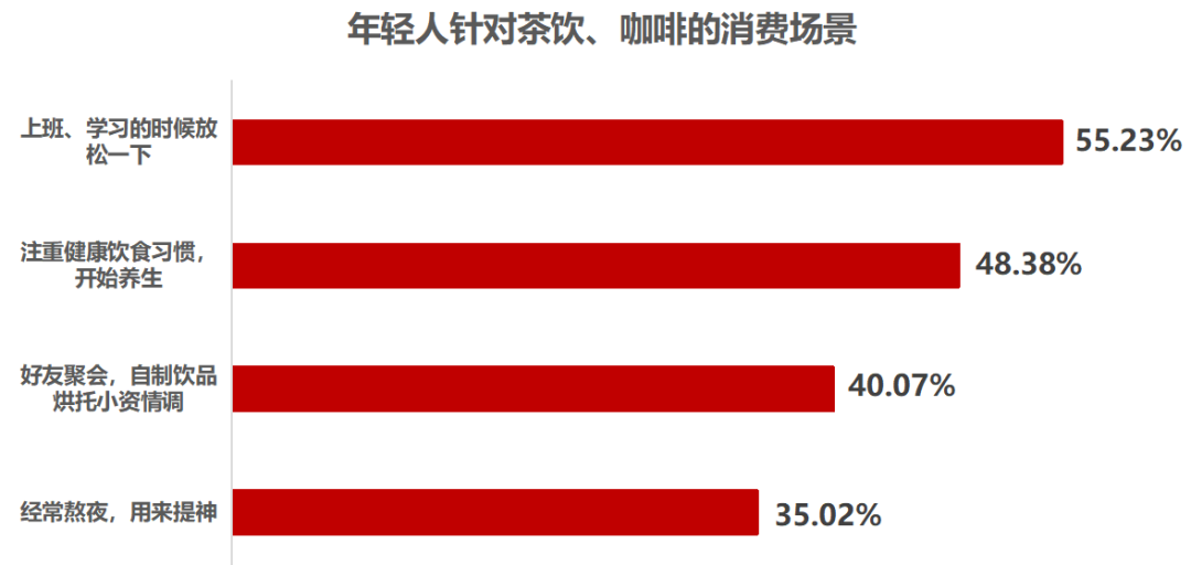 年轻消费者希望咖啡、茶饮类产品具备养生、药效、提神、醒目等功能,反映了年轻一代群体对健康生活的渴望与期待。根据消费场景看,5成以上的年轻消费者选择工作、学习的时候通过咖啡、茶饮类产品放松。