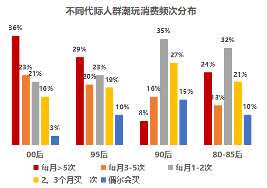 在“入坑”时长超过1年的年轻人群中,80、85后占比为21%;90、95后占比为63%;00后占比为14%。另外,在每月消费潮玩1次以上的用户中,每月购买盲盒占比为31%;每月购买拼装积木占比为30%;每月购买毛绒玩具占比为27%。