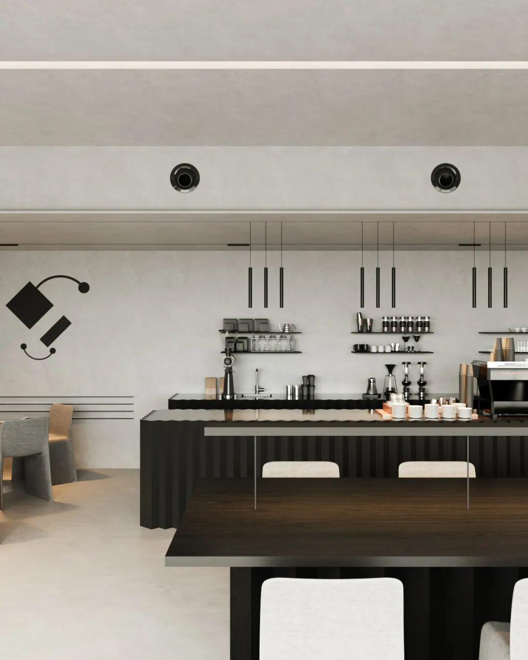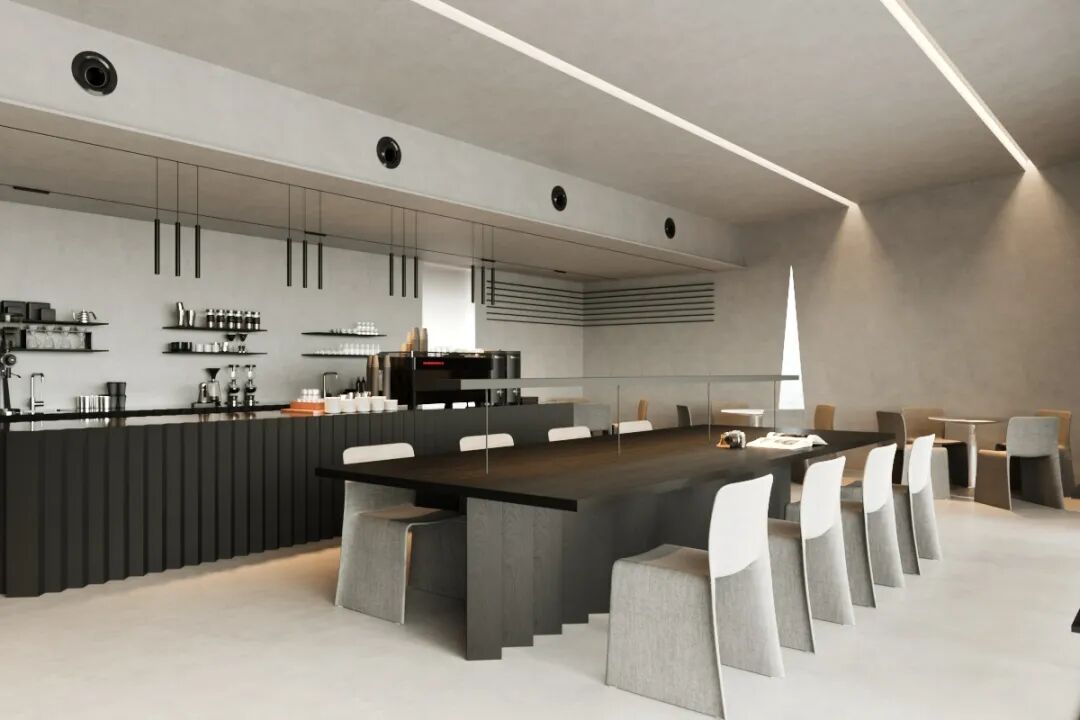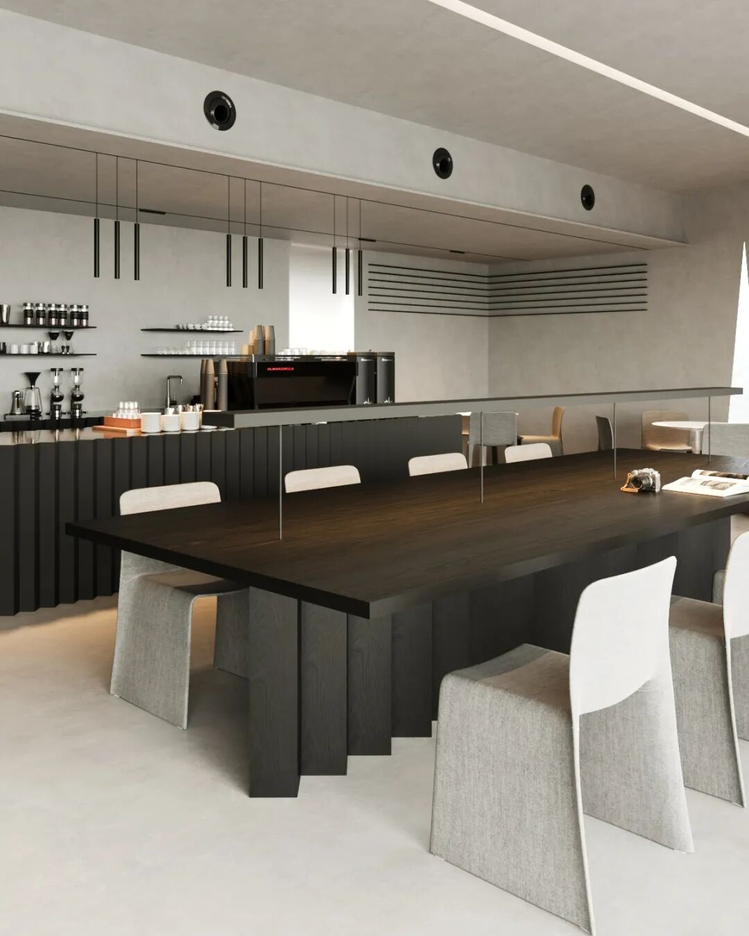 色彩上我们使用黑色木纹,原色的木质还有金属的吧台,打造出一种比较高级但又低调的商务洽谈空间。