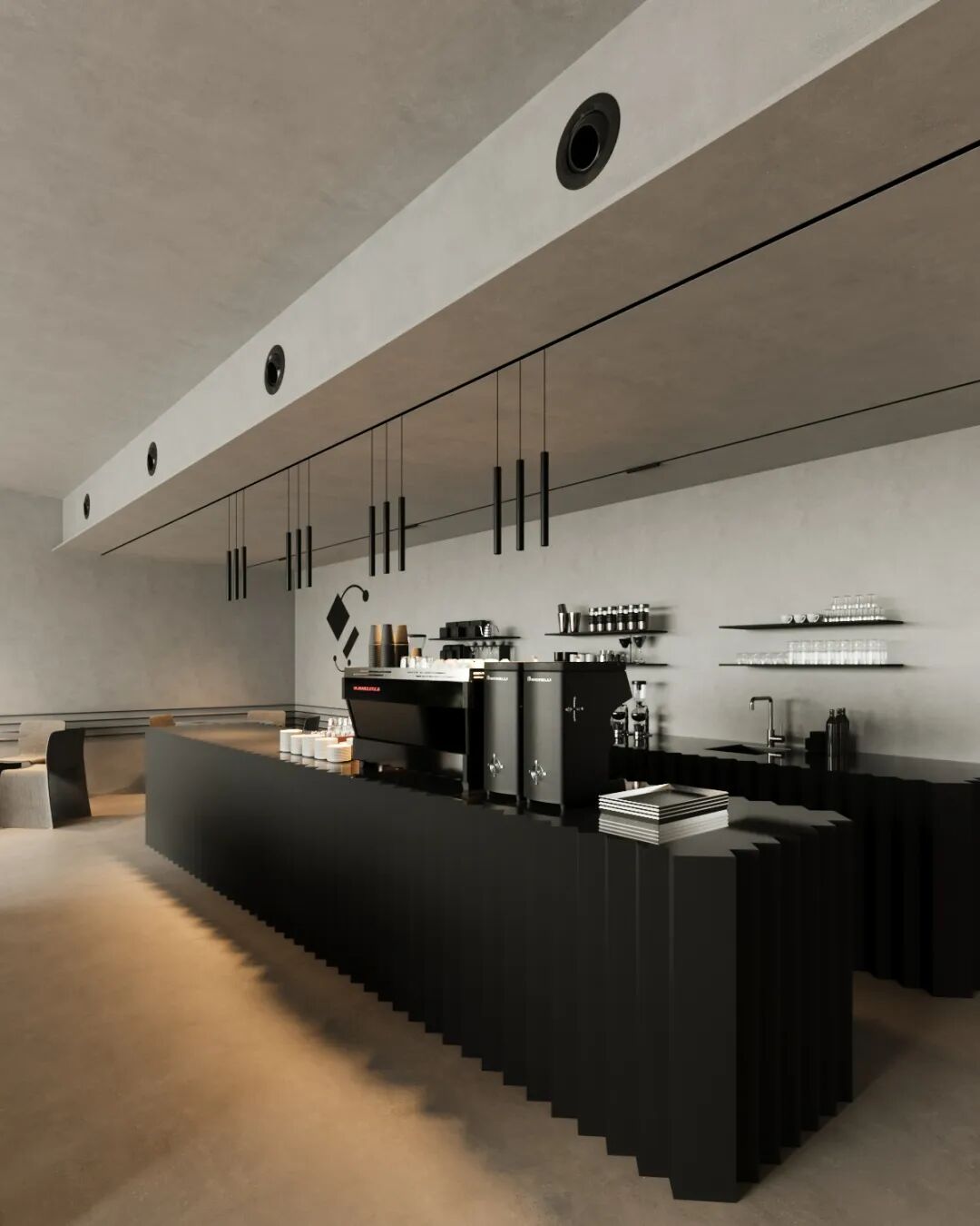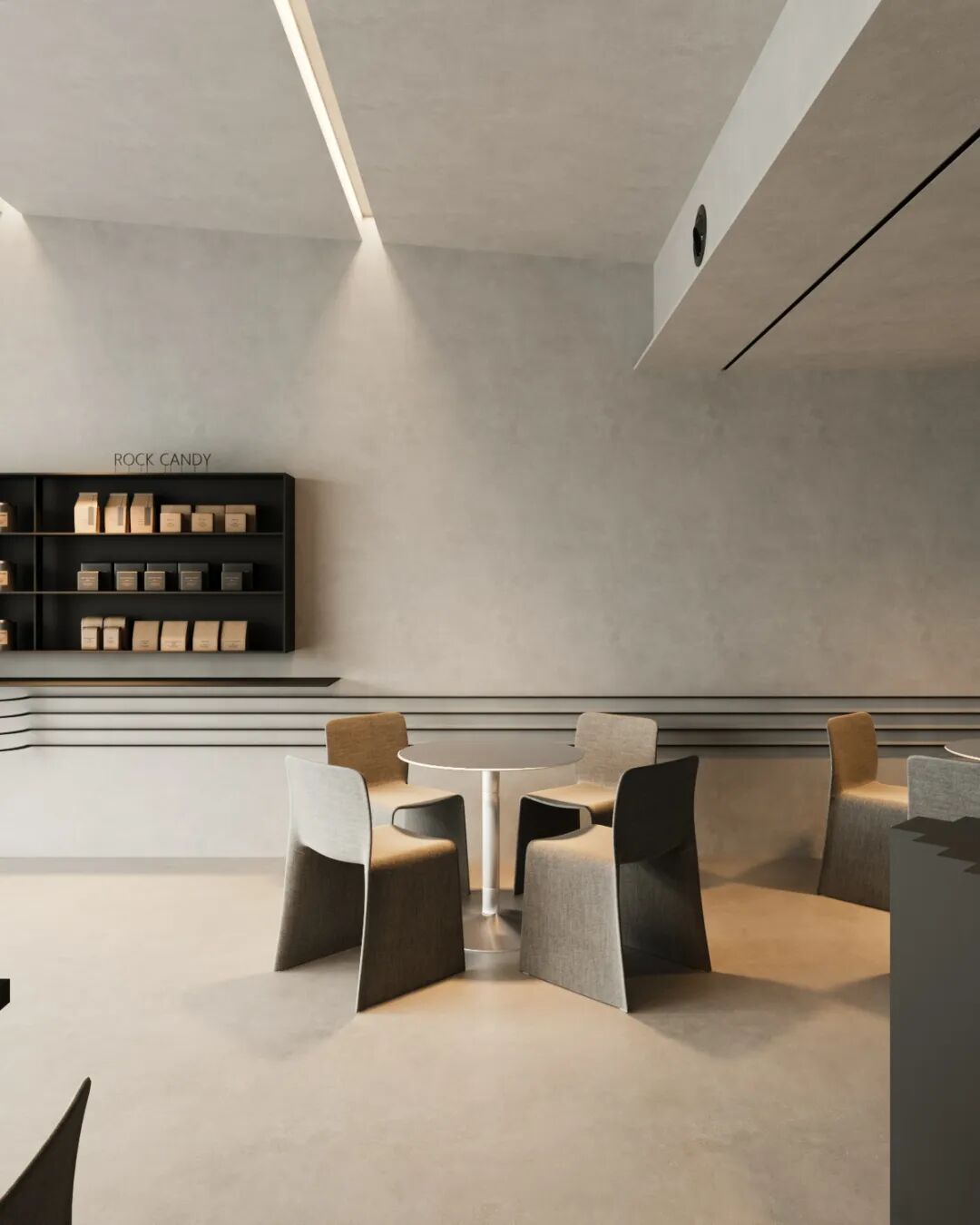 该品牌方本身的LOGO和方块有关系,在这个基础上我们整体使用的是矩形方块设计元素。整体设计干净利落,但慢反射的灯光,却透出暖意。