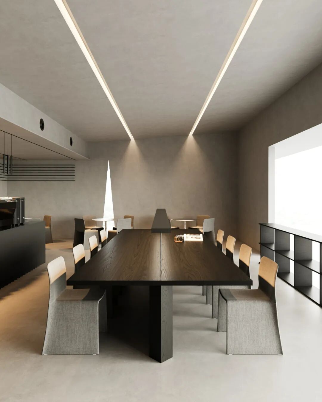 采用原木色的大长桌子,桌子上方配置柔和灯光,营造一种慢而且轻松的办公氛围。靠墙的四周我们布置了散座,座位换成舒适度高一点的软质材料,满足商务洽谈需求。