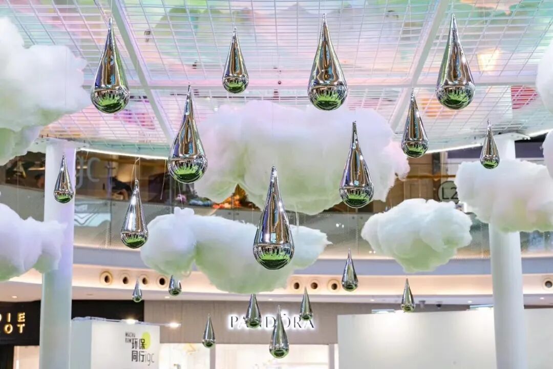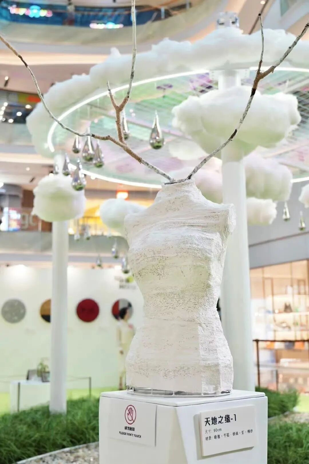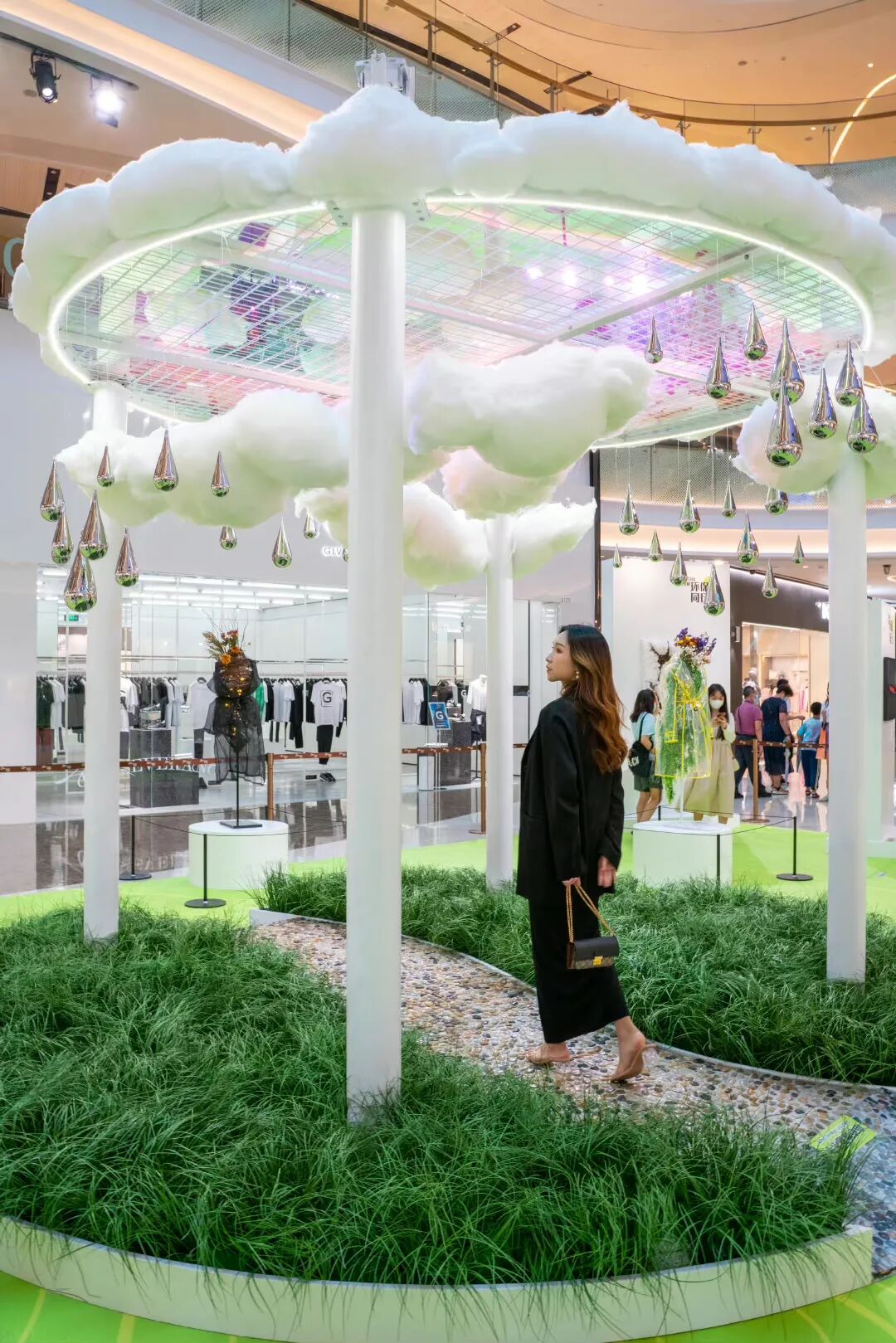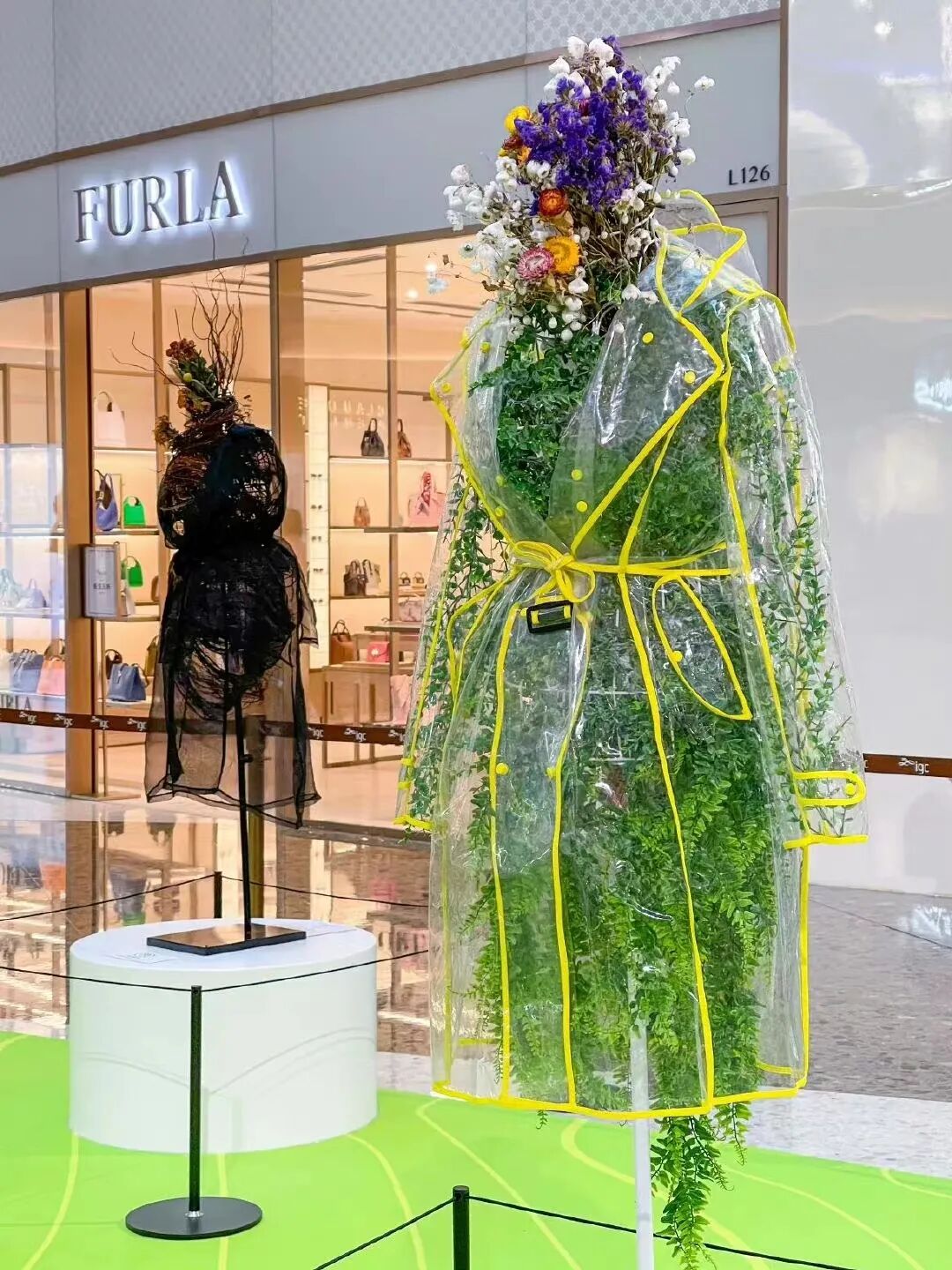 展览现场最惹眼的是占据“C”位的“云雨”装置,让人感觉虽身处都市中的商场,但大自然的清新绿意却扑面而来,“绿色环保”蔚然成风。