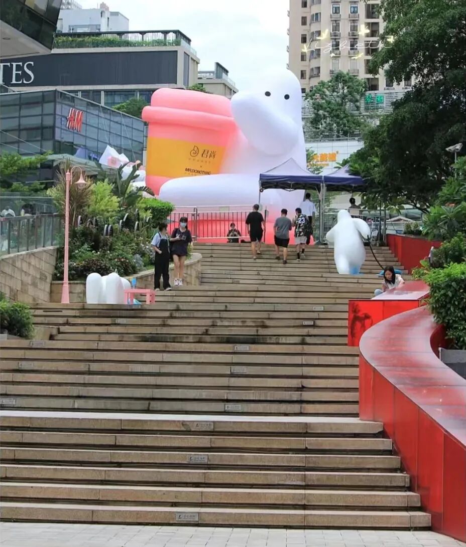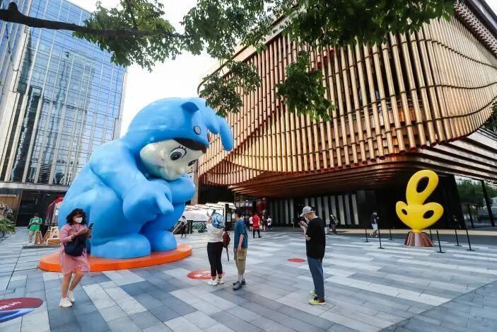 南区户外广场的艺术装置《无招胜有招》由艺术家tango呈现,憨态可掬的传统招财猫形象结合跳绳运动,展现了全新的趣味互动形态。