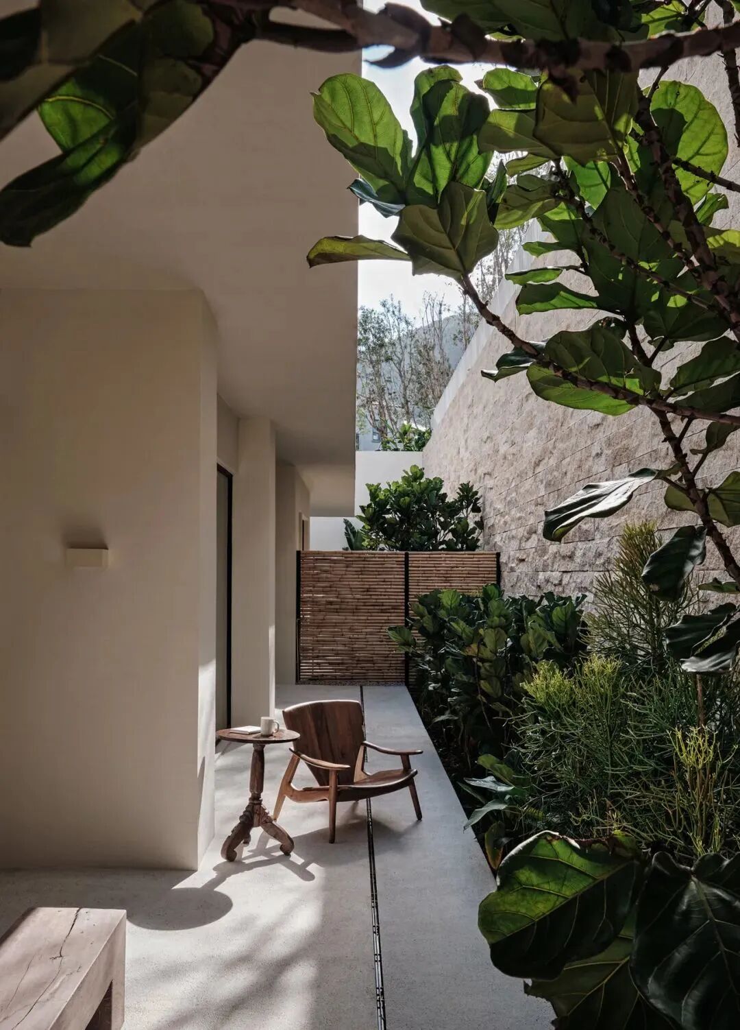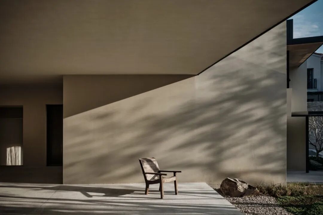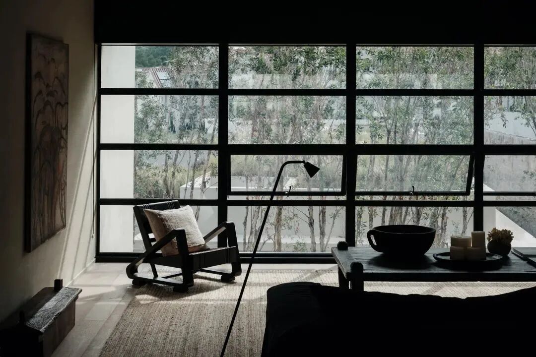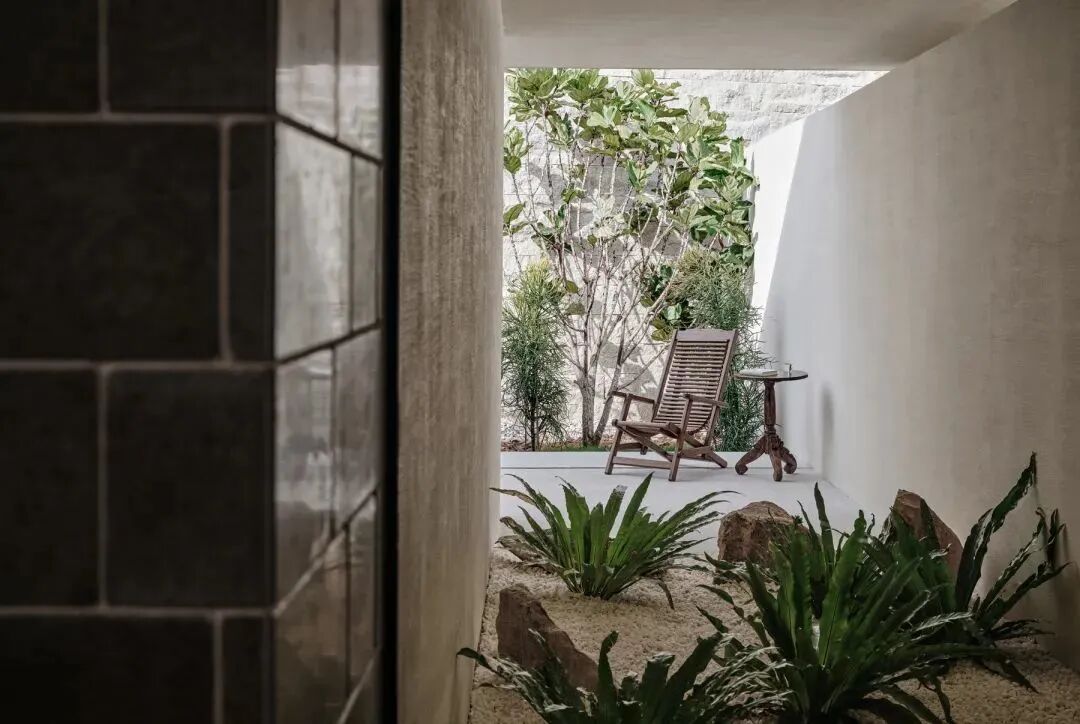 温度适宜时,居者可移动打开玻璃门进行通随时步入种满植物的私密庭院。院外,只放置一张拙朴条凳或者一把温润单椅,好似简单轻声地提示:「慢下来,放松下来」。