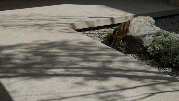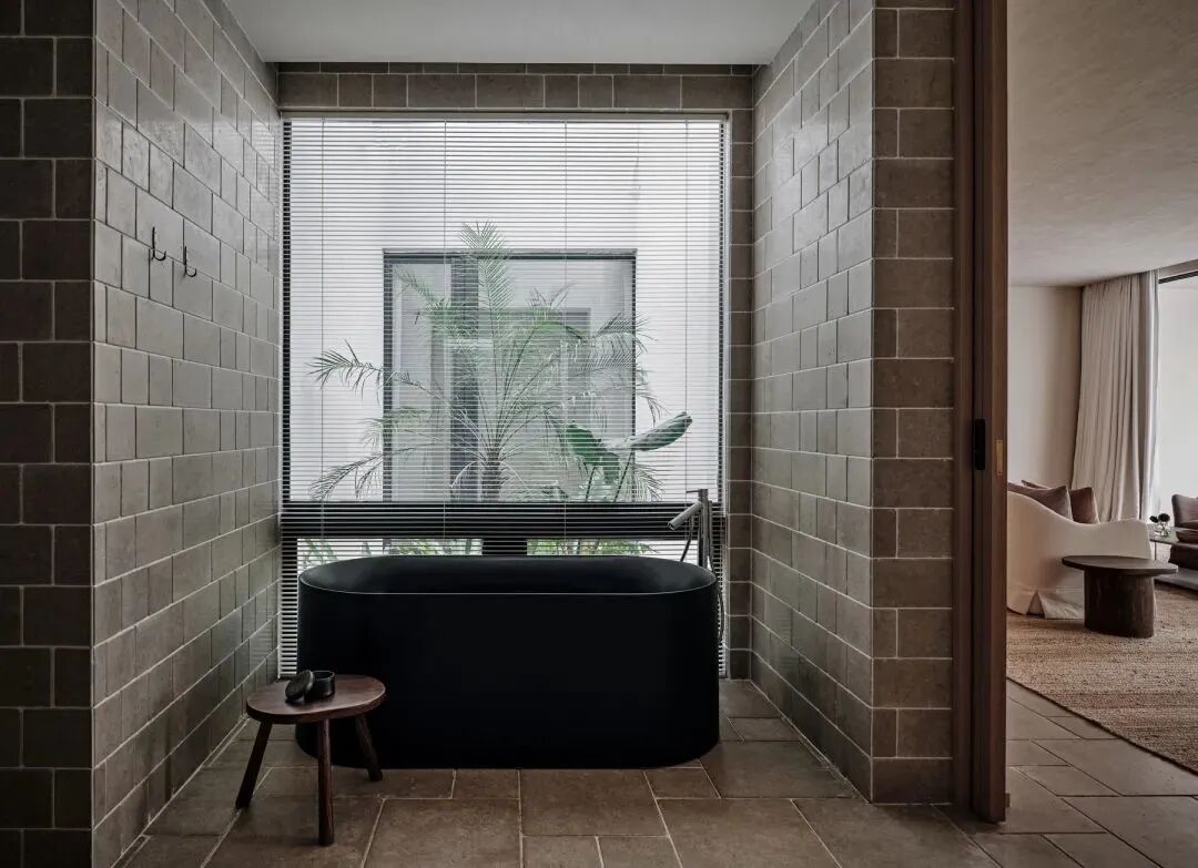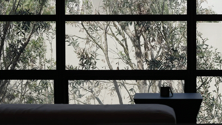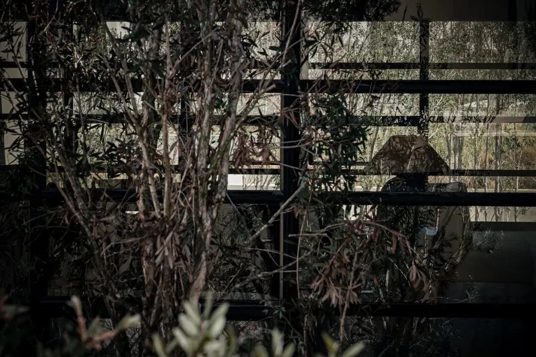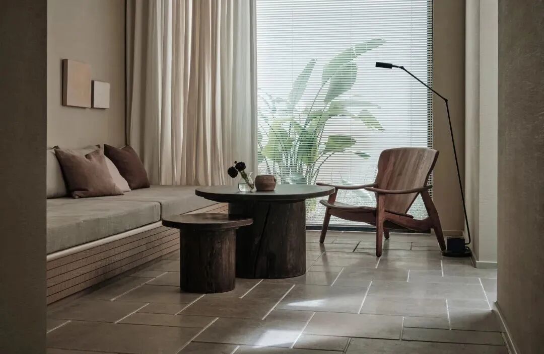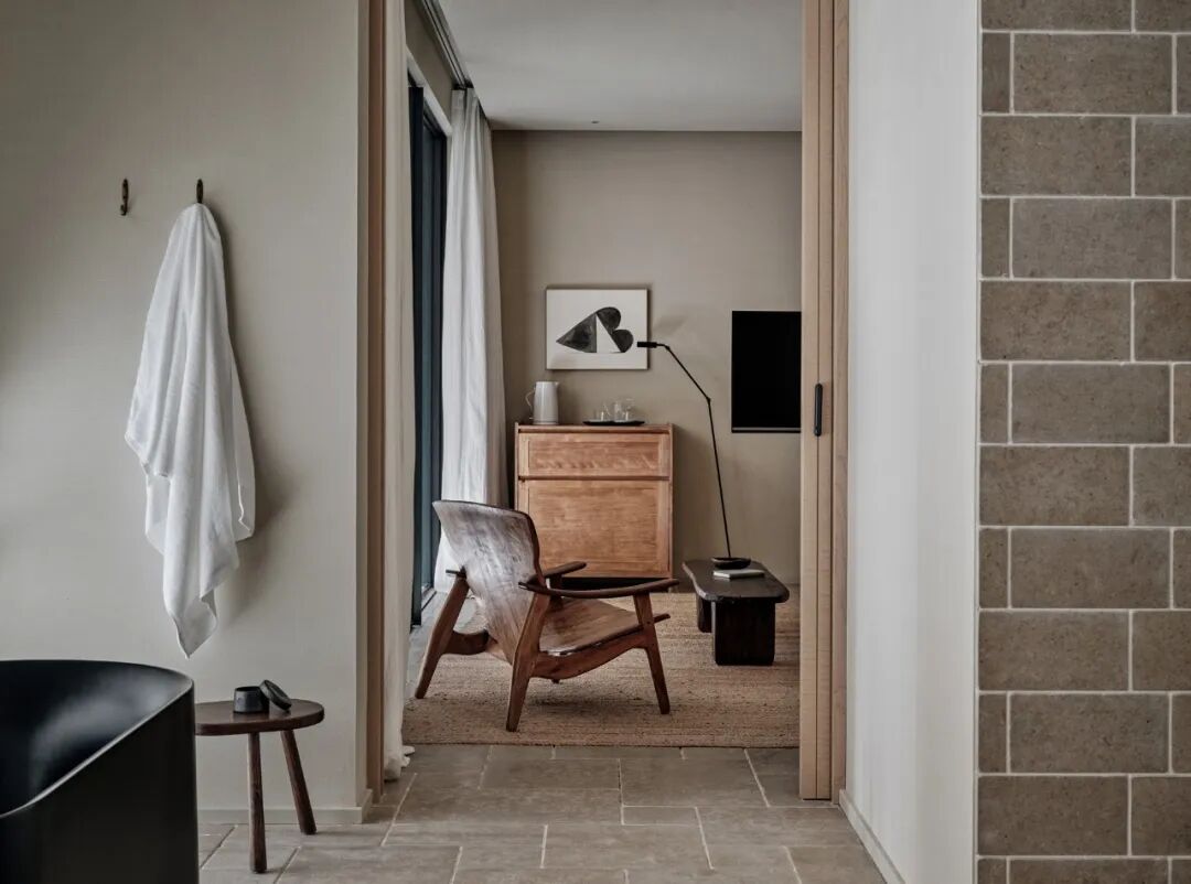 温度适宜时,居者可移动打开玻璃门进行通随时步入种满植物的私密庭院。院外,只放置一张拙朴条凳或者一把温润单椅,好似简单轻声地提示:「慢下来,放松下来」。