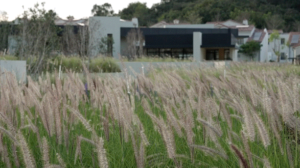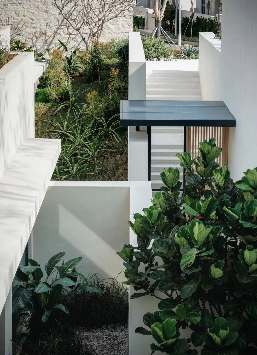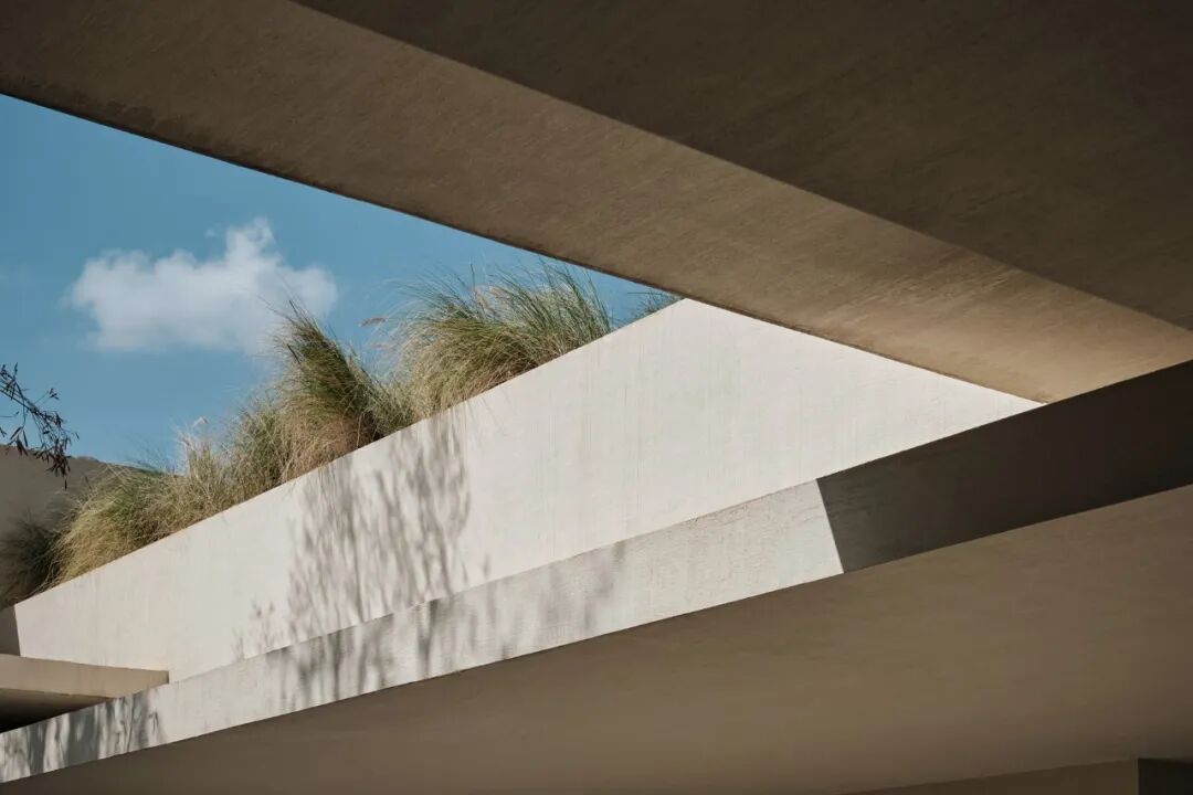 顺着小楼梯,可以走上屋顶近距离亲近「野生花园」,一片疏朗的芒草将在三亚的阳光与雨水下疯长,爬藤类植物会随着时间慢慢垂吊下来,蔚蓝的天空下,人如在海边,如在旷野之中。当矮墙逐渐消隐,内外的边界变得更模糊,建筑的几何元素也会跟着柔软起来。