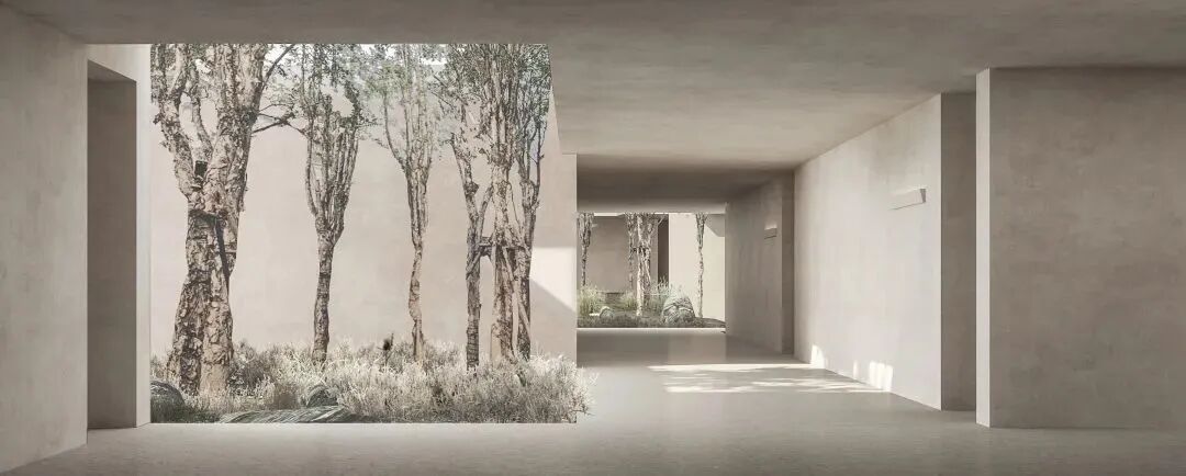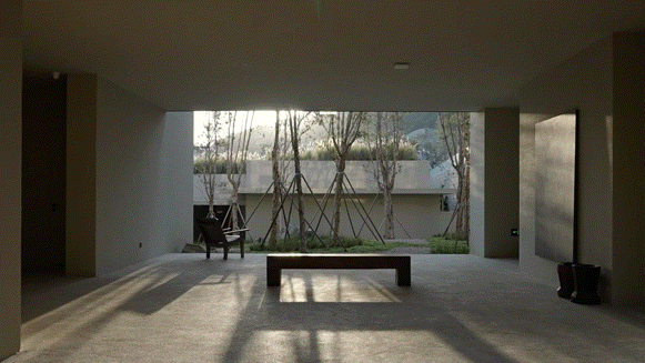为避免在「地下」的感觉,建筑落下很多大尺度的花园。阳光从天井倾洒,风能在此自由穿行。建筑隐约在自然里,在镇静与诱导之间,欣赏、触及、体验到的是一种特定的感知,而非某一个具象的物。带着近似冥想的心境在空间漫步,在阴翳里感受安静的力量,在趣味的动线里感受精神的放松。