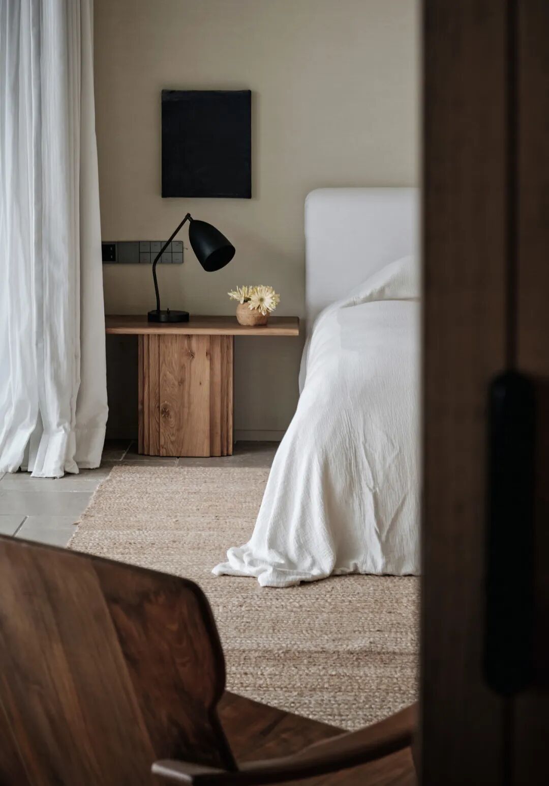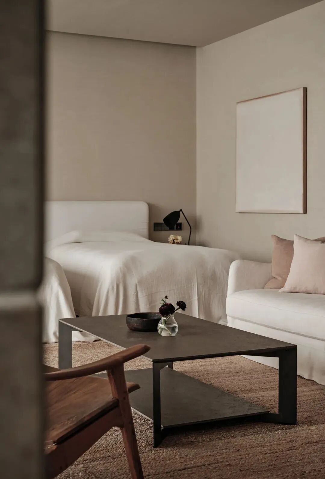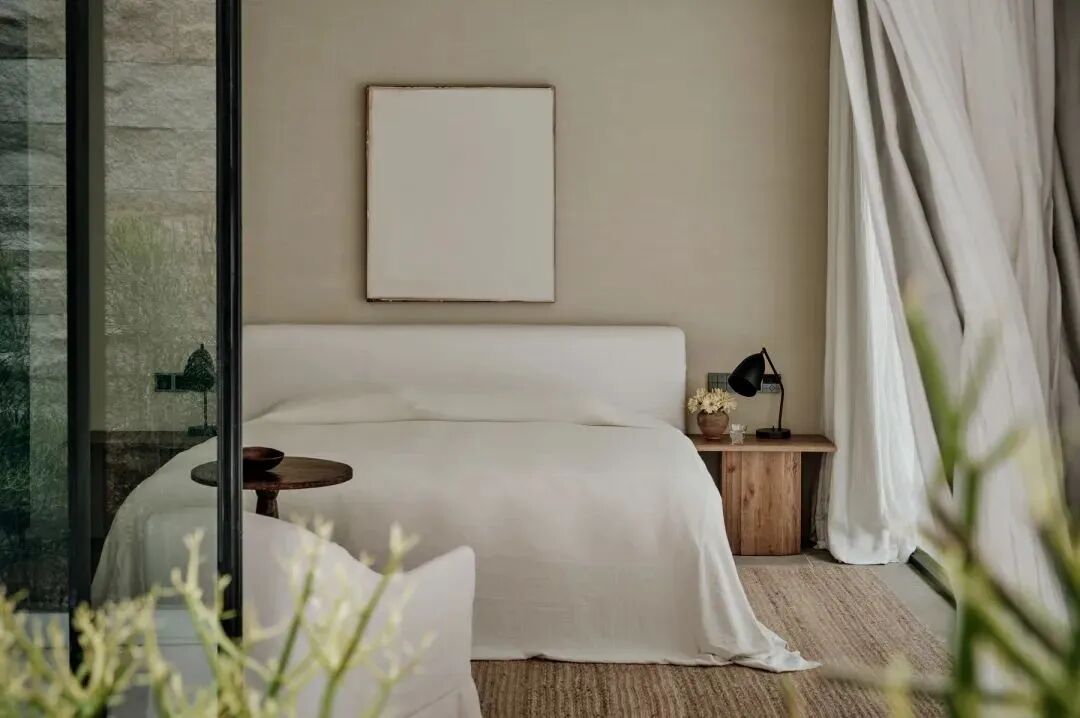 室内以低饱和度色彩和柔软的纹理为基调,不同层次的白色亚麻床品,画作,地毯…局部以克制的黑色元素作为装点,体现于极窄框的玻璃门、金属灯饰的构件、木质家具中。