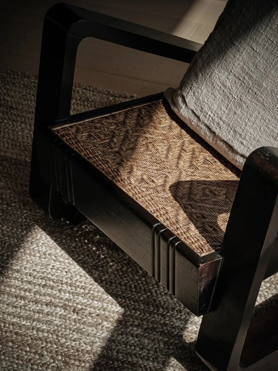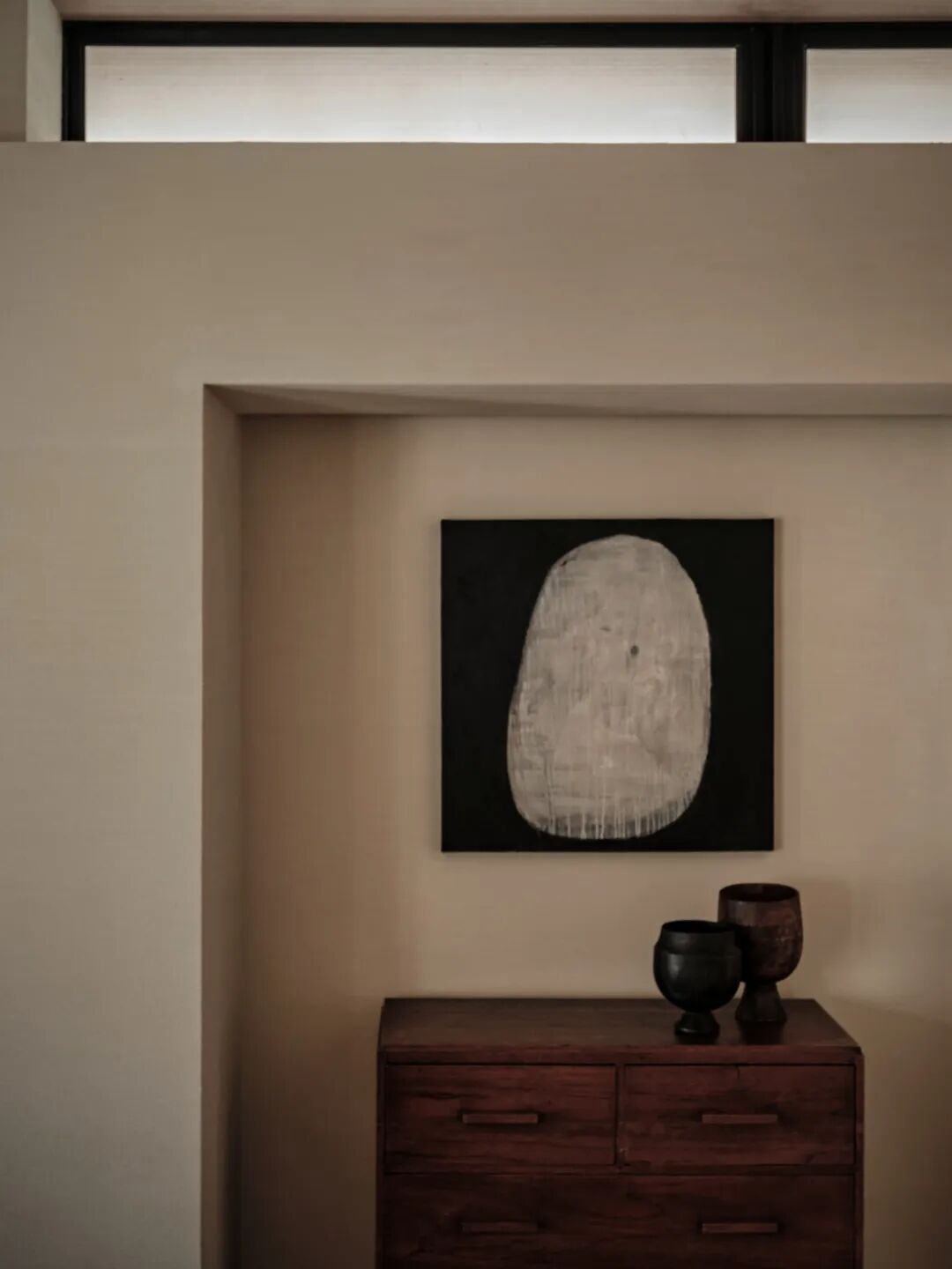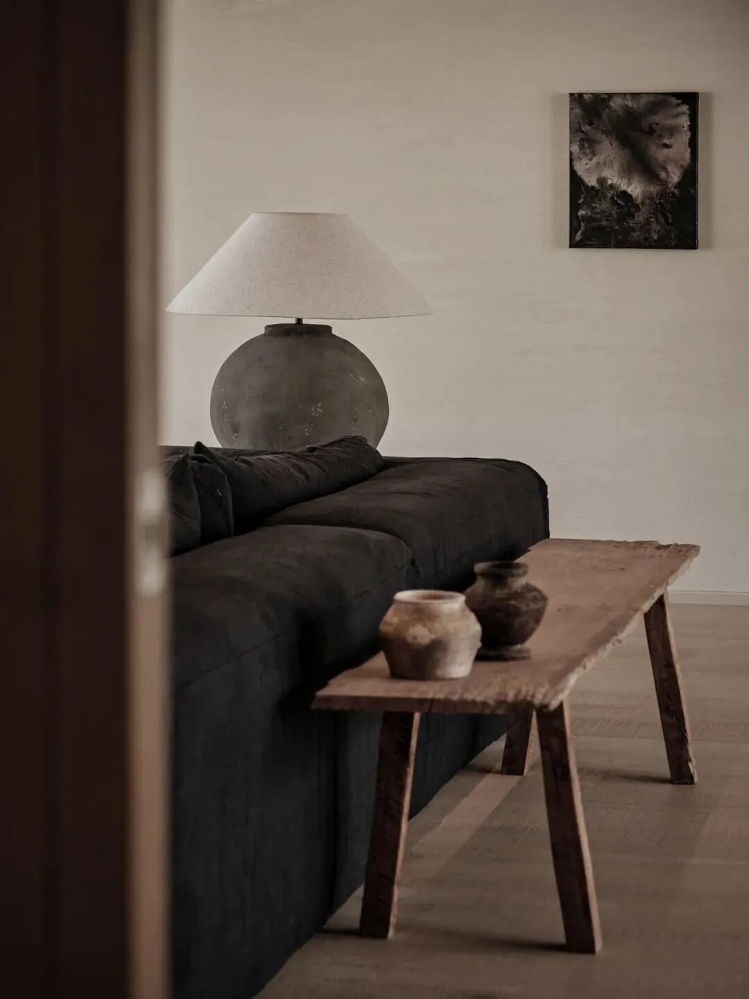 室内以低饱和度色彩和柔软的纹理为基调,不同层次的白色亚麻床品,画作,地毯…局部以克制的黑色元素作为装点,体现于极窄框的玻璃门、金属灯饰的构件、木质家具中。