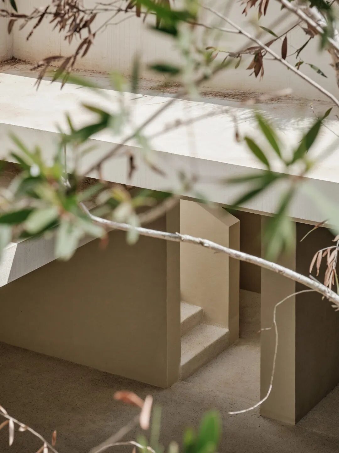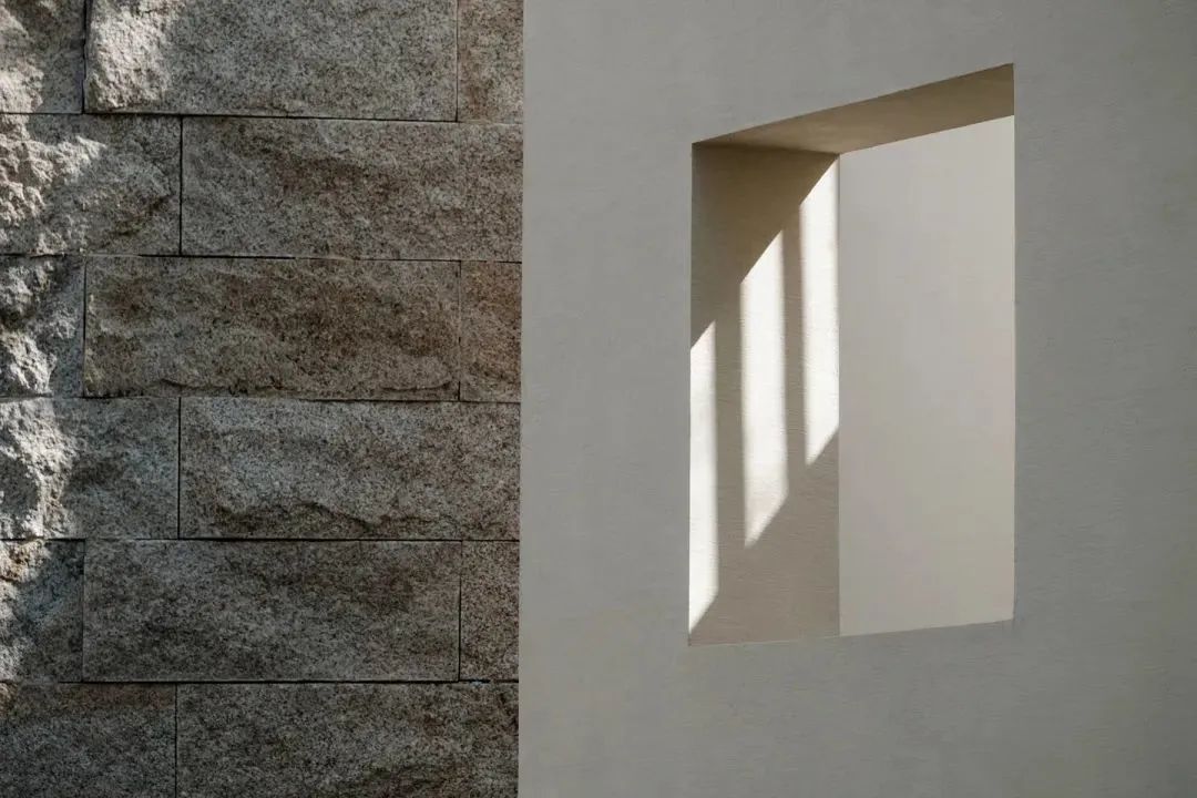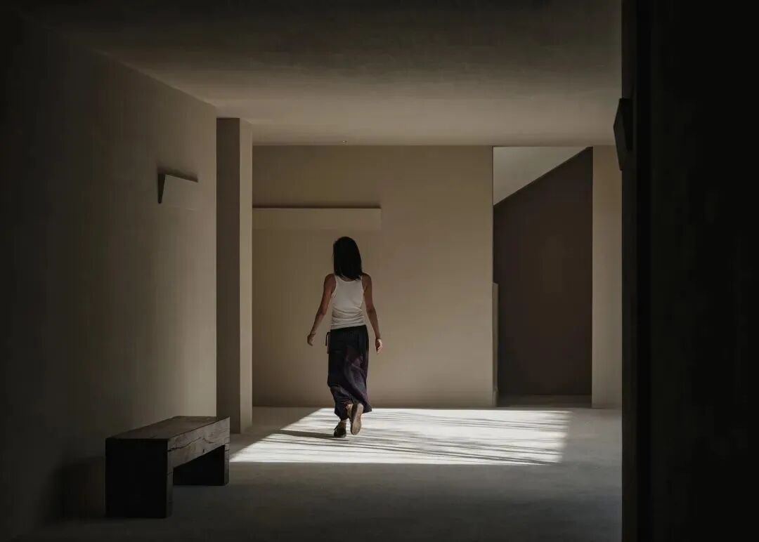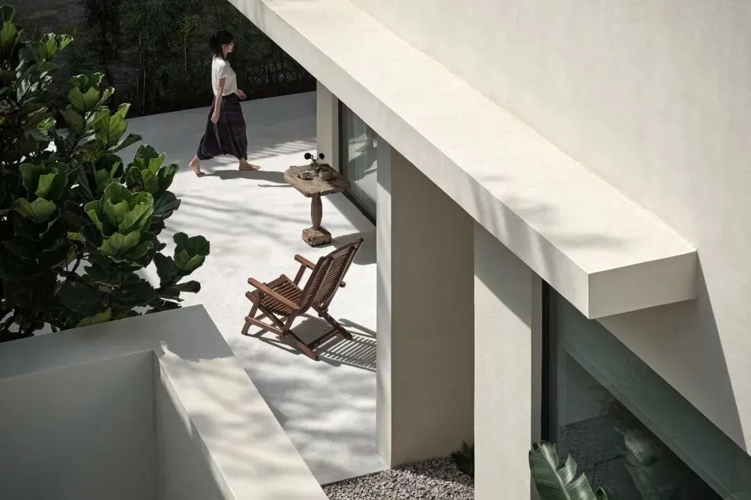 鉴于当地气候与光照,宽敞的挑沿既能遮挡阳光,又避免了与高地产生对视,满足建筑的功能性。同时予人庇护感。走廊灰空间,处在自身的沉静中,十分开阔自在,呈现出一种「空」的状态。
