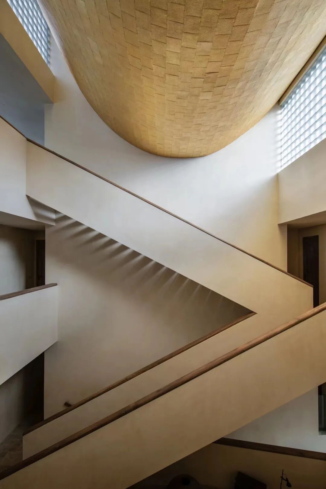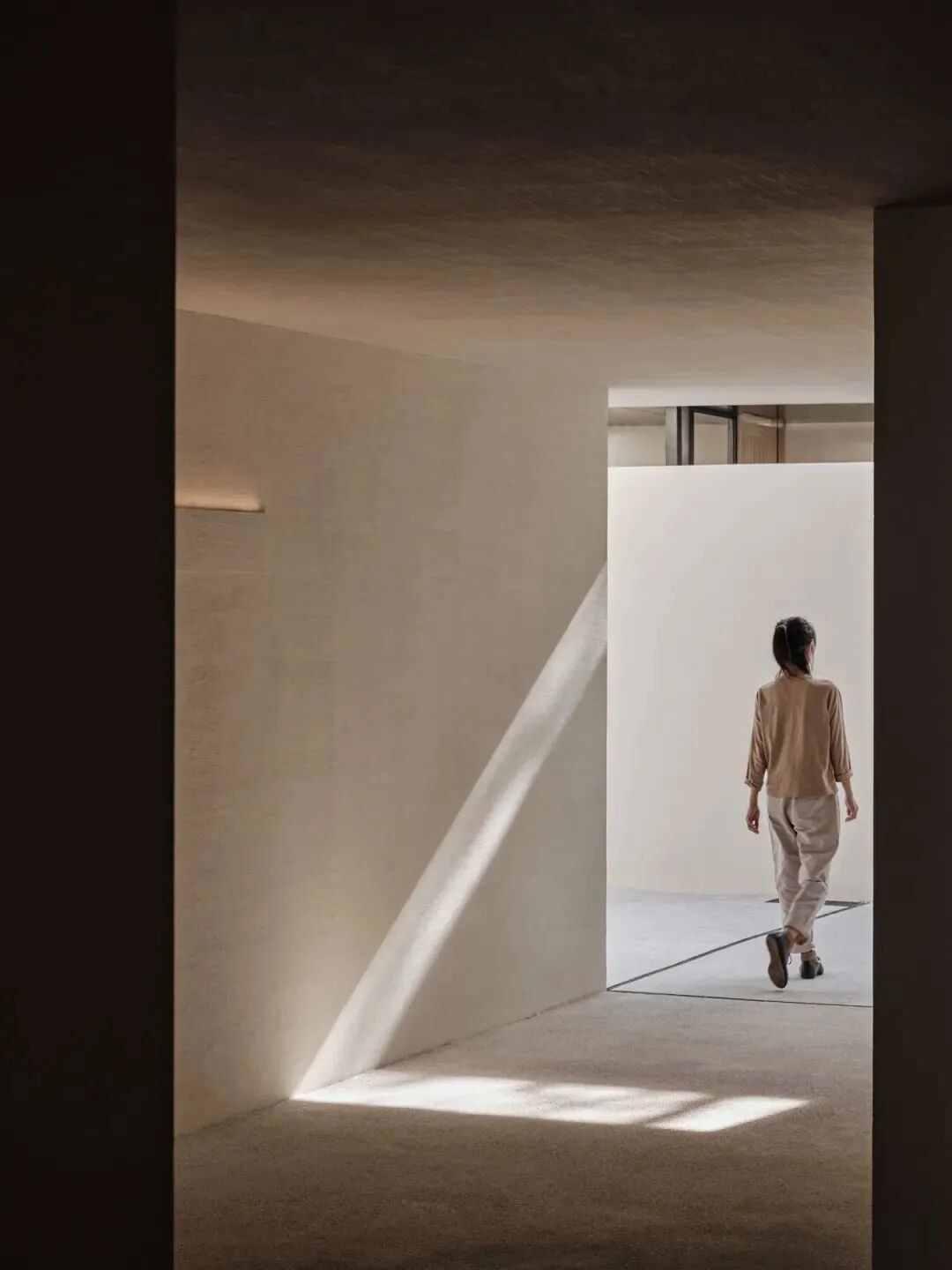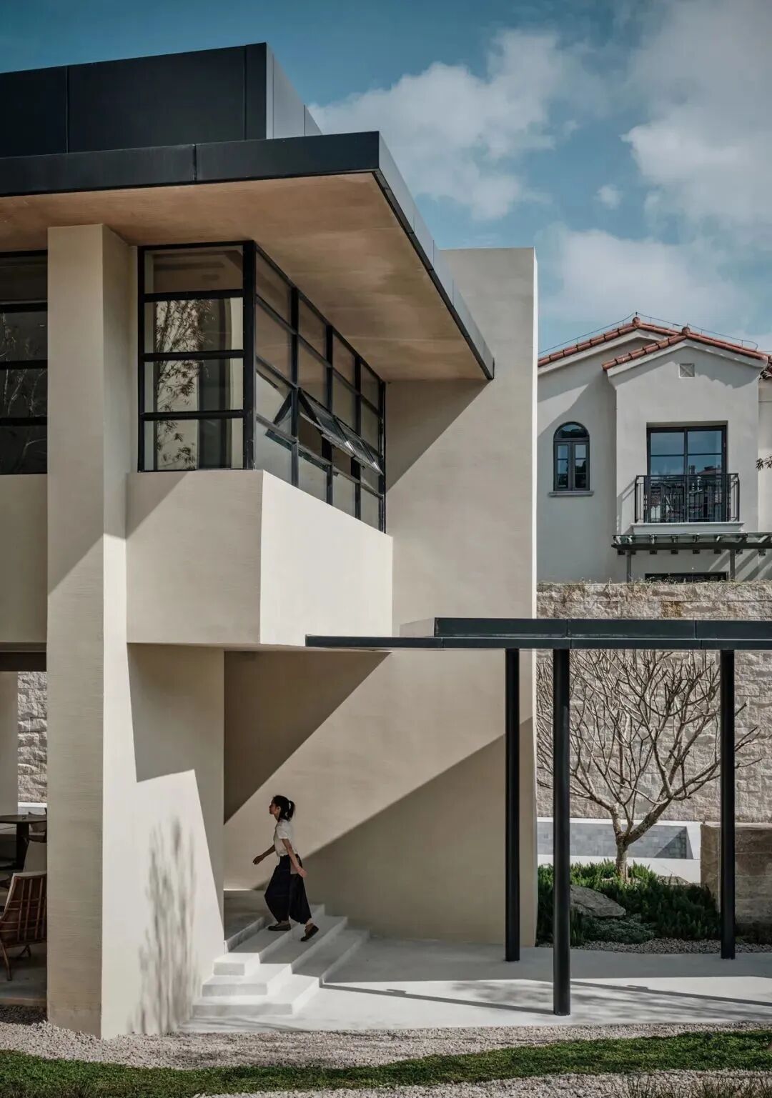 鉴于当地气候与光照,宽敞的挑沿既能遮挡阳光,又避免了与高地产生对视,满足建筑的功能性。同时予人庇护感。走廊灰空间,处在自身的沉静中,十分开阔自在,呈现出一种「空」的状态。