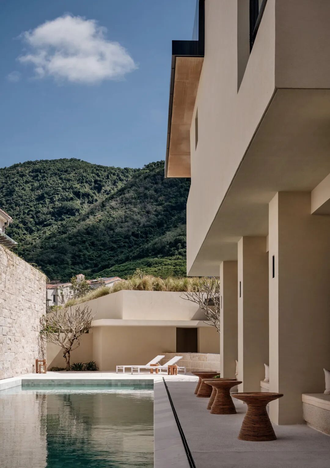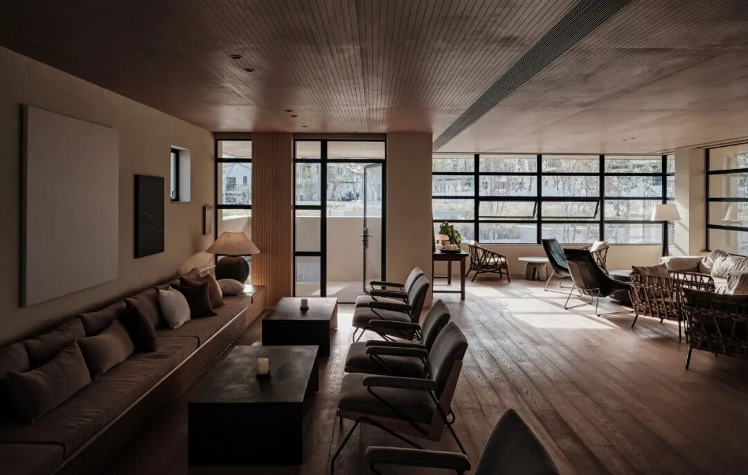 窗洞位置及尺寸大小,经过了细致的考量设计,例如靠近住宅与楼下泳池方向的墙面只留了几扇小窗,避免视线的对视,保证私密性,同时也框住流云,组合成画。公共区域的视觉通透性最大化,这样,无论人们立于何处,都能更多地亲近自然,被茂密的植被围绕,人的内心会充盈着平静的喜悦。