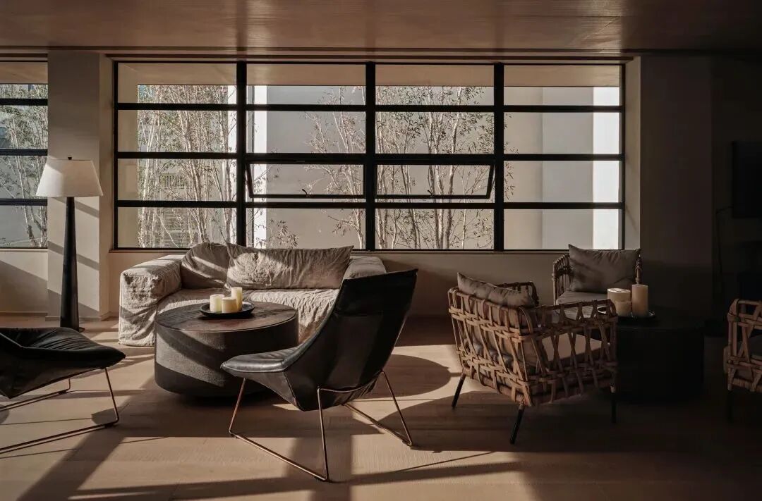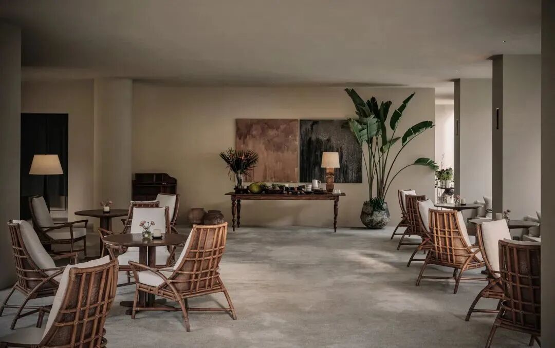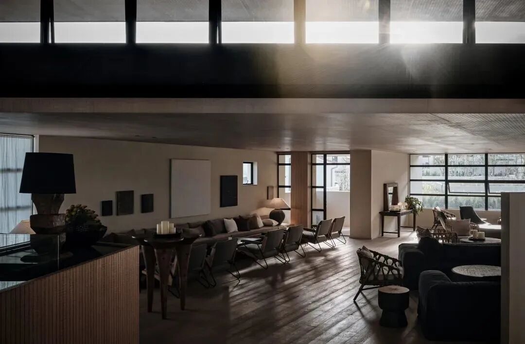 酒店接待厅更像一个「家的客厅」,空间沉静,早晨的光与影将穿过白千层树叶蔓延进室内,带来清凉与安宁。在这里能望见屋顶的花园,也可俯瞰下沉的庭院。