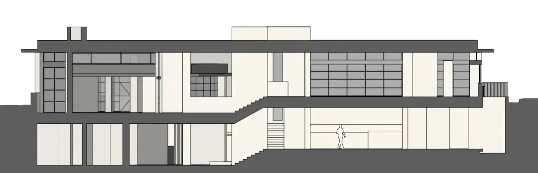 在负一楼,我们释放出更多供人沉思的空间,将喧闹隔离在这个小世界之外。留白,亦是能容纳下万物:光线、秩序、情绪,自在的呼吸。将建筑沉下去,后花园与旁边的住宅之间做了约有6米高落差的垒墙,如此一来住宅与建筑相互之间是完全没有对视的,同时与阳光保持着恰当的距离。