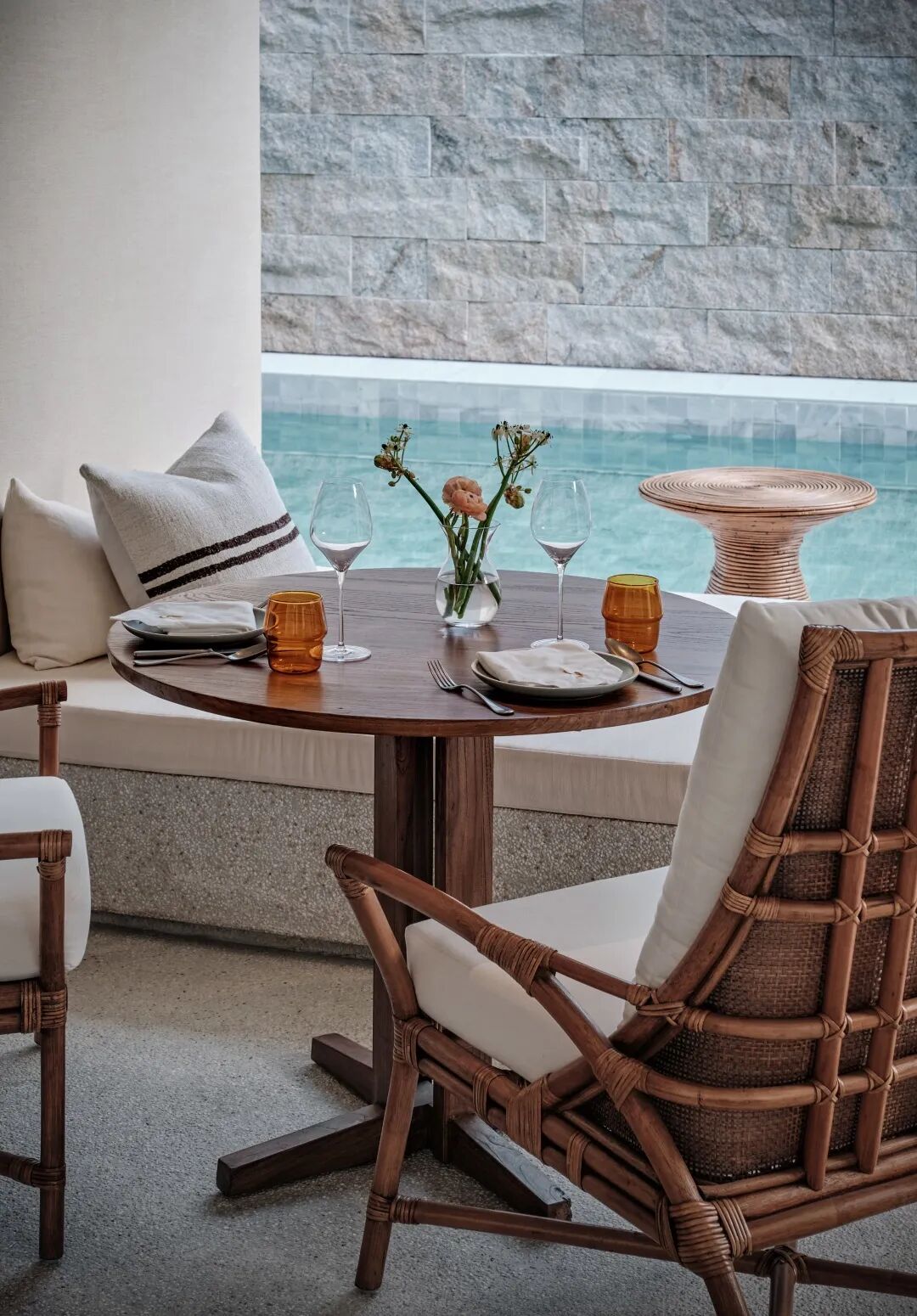 餐厅与泳池相连,室内柔和的色调中引入黑色元素,带来现代的气息,营造一种内敛舒缓的就餐环境。泳池倒影着青山白云,休息区隔而不断的墙体,有序匀质地排布。光影落在米色的石壁墙面及地面之上,忽明忽暗,自然与空间借此相互联接,模糊掉室内外的界限。