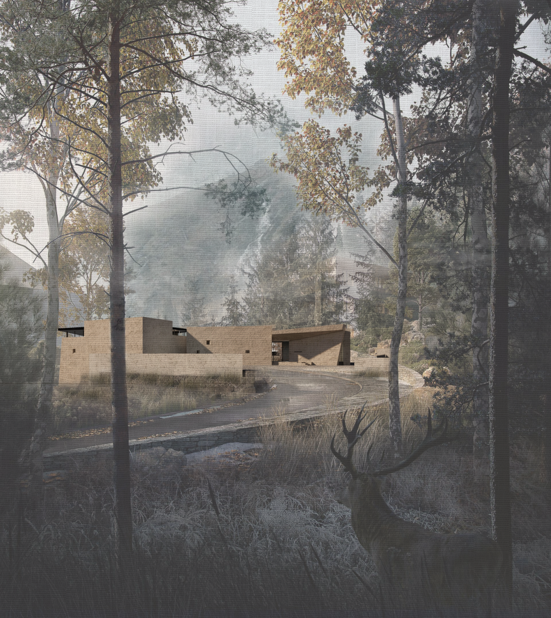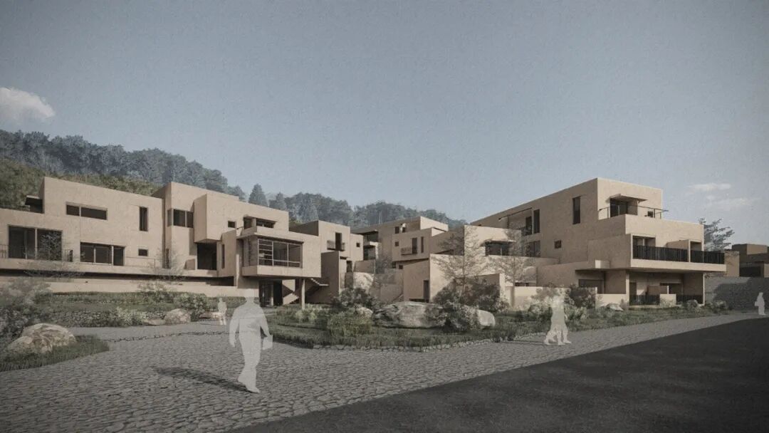 Y hotel & Kitchen 的入口是一片靠近社区环道的空地,酒店与餐厅各自独立,由一个灰空间相连接。山成为模糊的远景,建筑则好似山的一隅,谧地隐藏在社中。