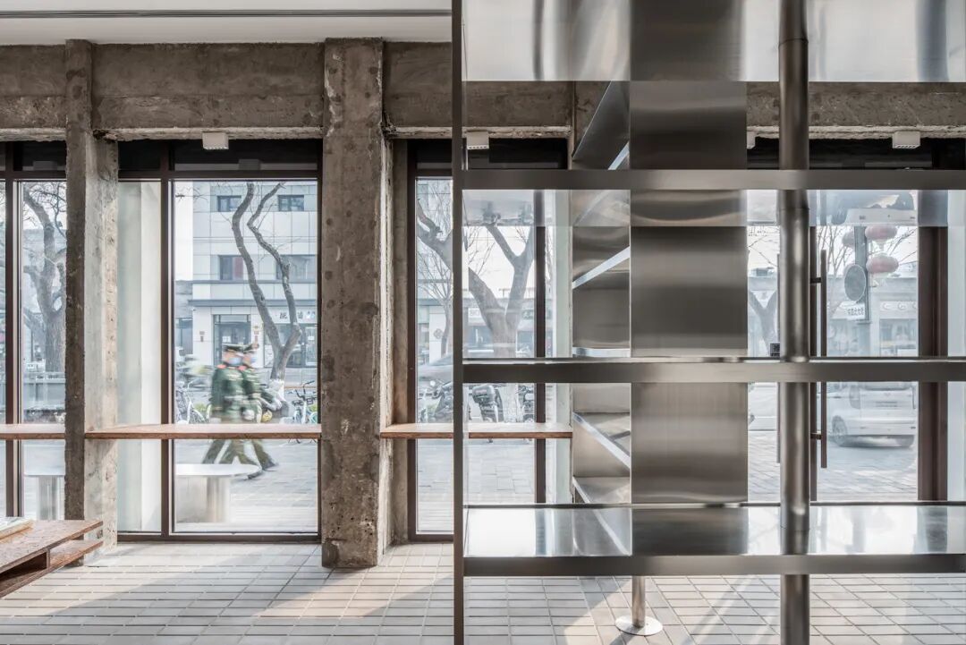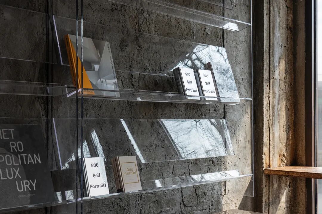不锈钢、亚克力的光滑细腻与未做涂抹的混凝土墙面肌理碰撞,是书店主理人乌云装扮者很喜欢的柏林小书店的调子。