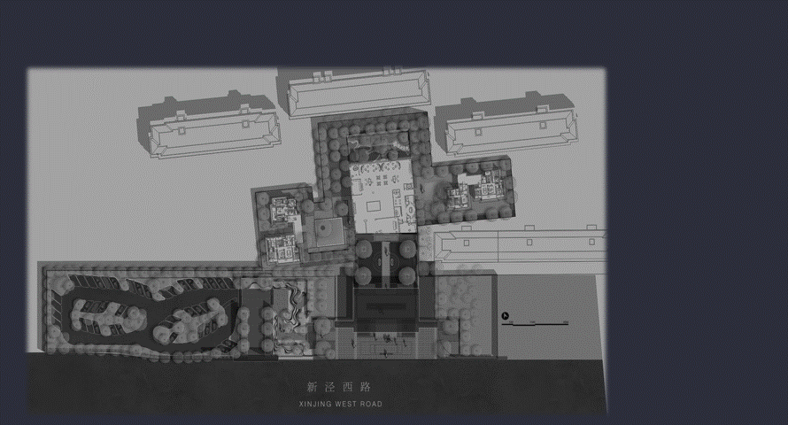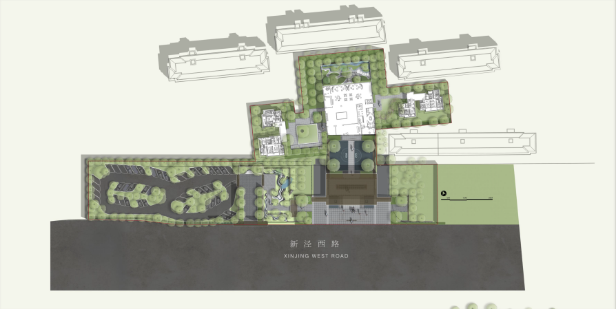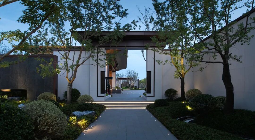 景观设计取意北方王府的经典格局和江南院落的自然灵动。整体空间由前后两部分组成, 前面是富丽堂皇的府邸,后面是幽深秀丽的花园。
