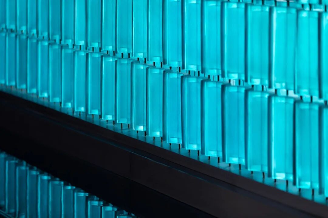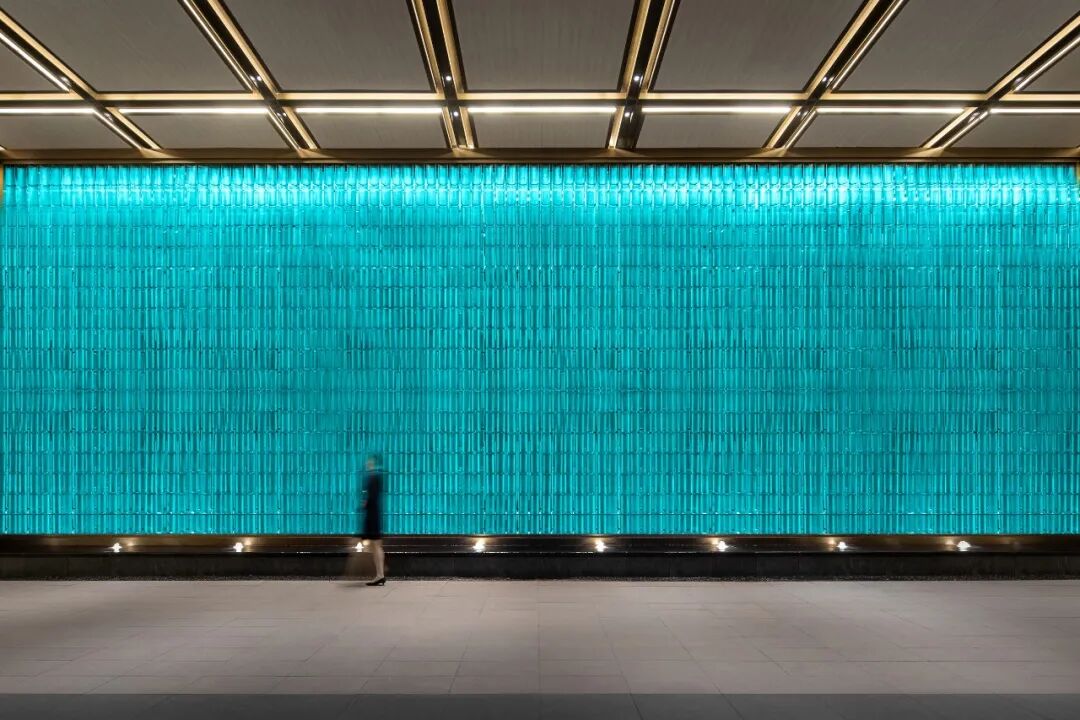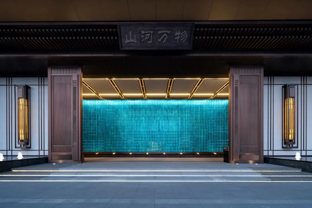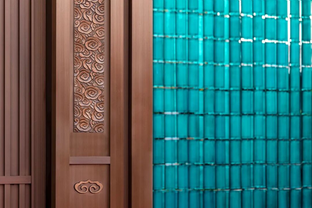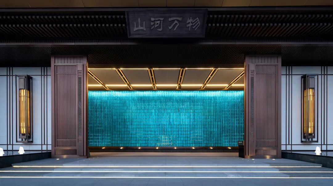 大门内的琉璃屏风取意恭王府中轴建筑绿色琉璃瓦,整面屏风由3000多片定制琉璃瓦组合而成,意在通过玻璃这种现代材质对传统建筑元素进行转译,并选取古典的孔雀蓝色作为主色调形成震撼的视觉冲击,彰显传统府系大院的尊贵感。