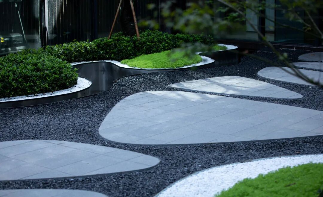 以砾石模拟流水,以绿色包裹建筑。视线透窗而过,片片绿屿和卵石状园路,优美的漂浮在深色“水面”上。