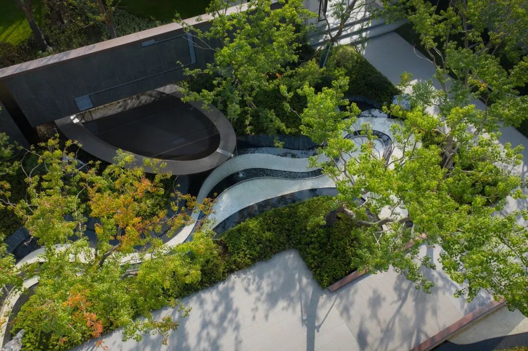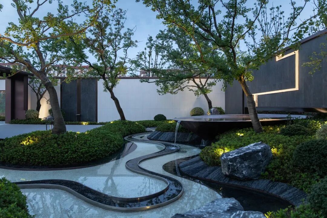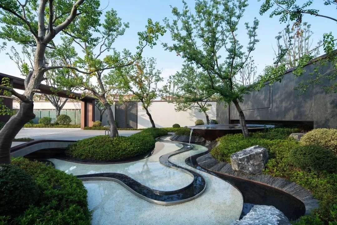 树影婆娑,景墙溢水,曲折尽致的花园,聚气藏福。听流水潺潺,观万物交融,让生活回归本源。