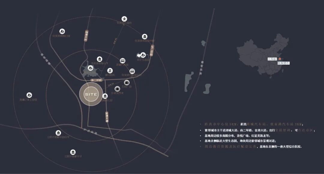 张家港市位于长江下游南岸,南与苏州、无锡相邻,风景秀美,是典型的江南城市。项目距离市中心仅5KM。南邻城市主干道,西侧临河。资源优越,交通便利。设计希望在此处打造一处无可替代的城市地标。